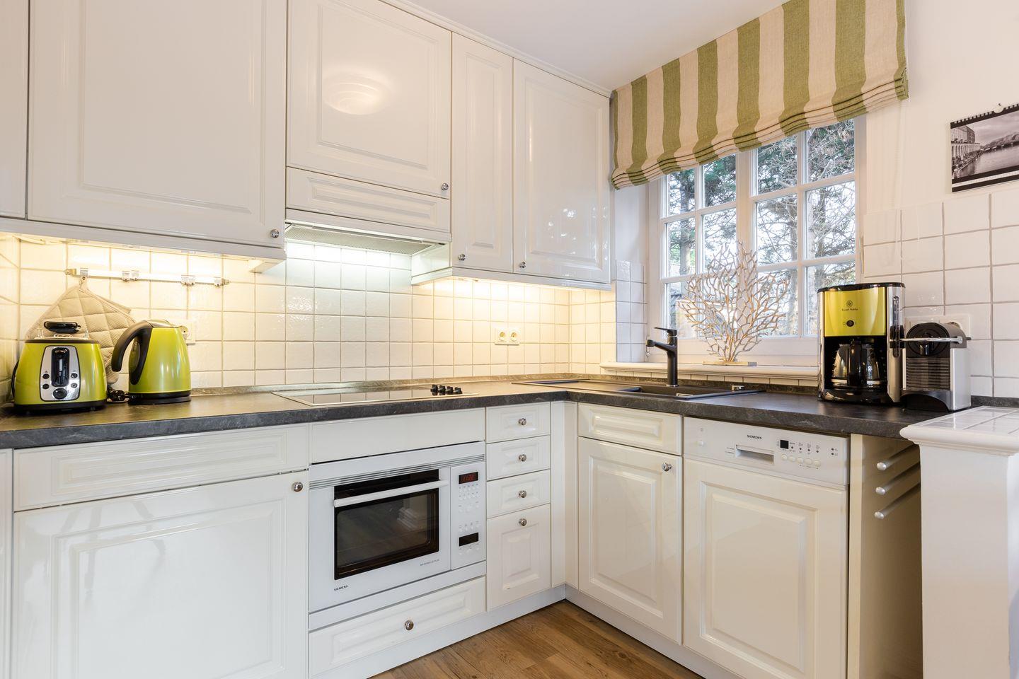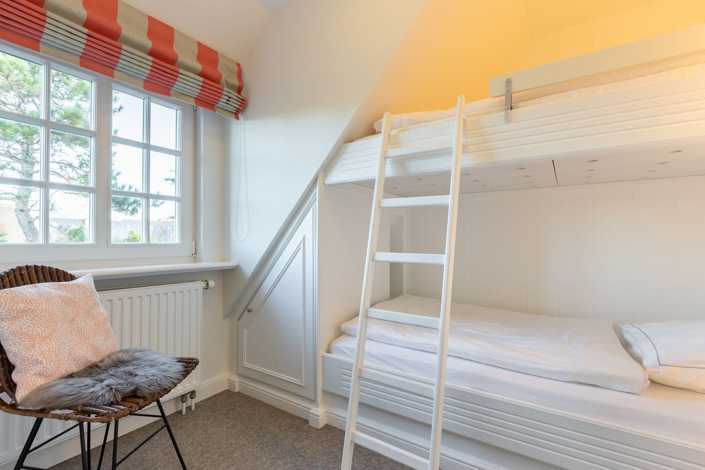 Obergeschoss: Sehr geschmackvoll und hochwertig eingerichteter, heller Wohnraum mit Kabel-TV, Hifi-Anlage und Telefon. Integrierte Küche im Friesenstil mit Geschirrspüler, Mikrowellen-Backofen Kombination und einer Nespresso Kaffeemaschine. 1 Schlafraum mit eingebautem Etagenbett (unten 90x200cm & oben 90x180cm) Dusche/WC.