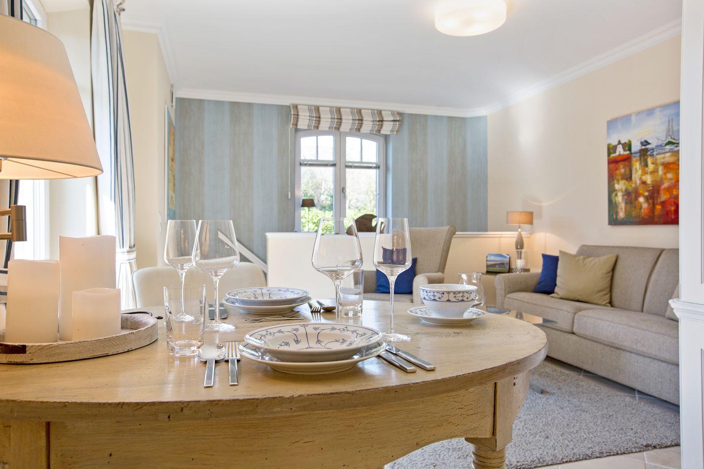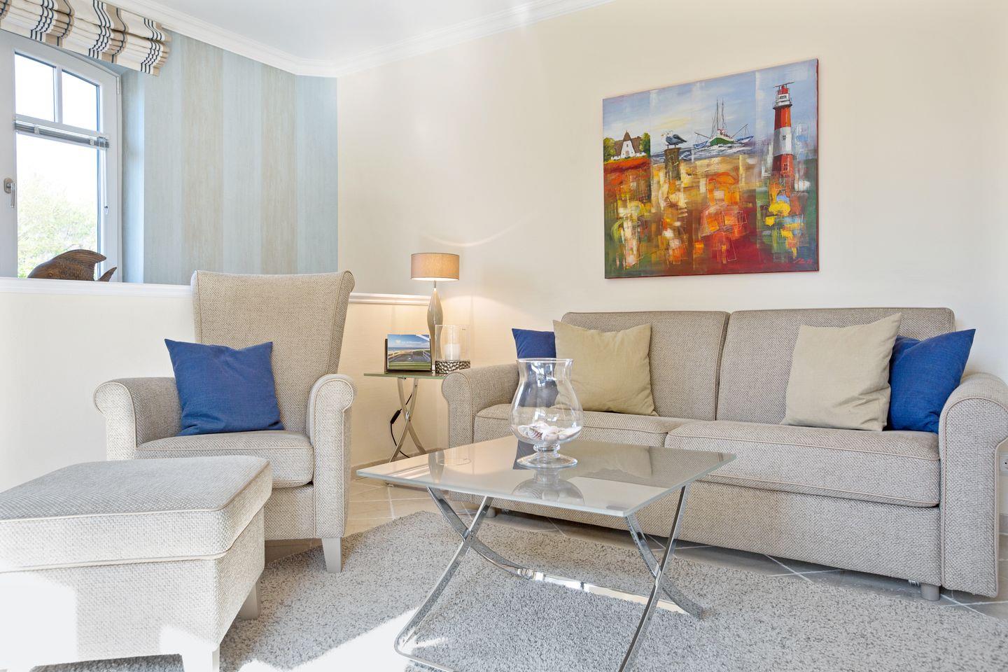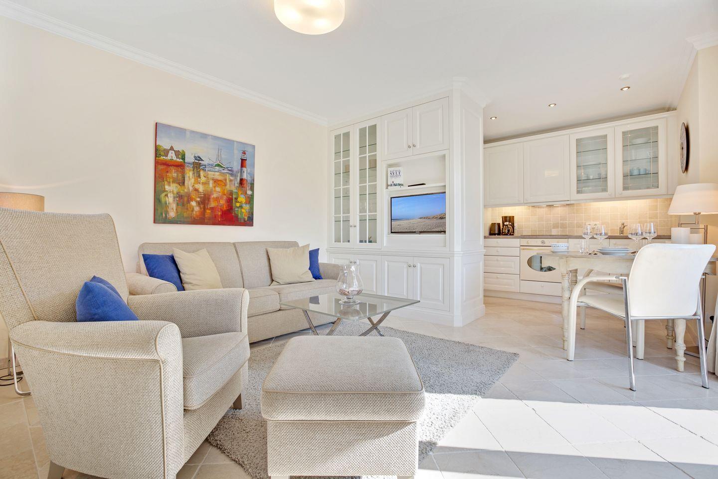 Innen überzeugt Ihr Domizil mit einer sehr geschmackvollen, wertigen Möblierung. Freuen Sie sich ebenfalls auf Ihre kleine Luxusküche und ein sehr schönes Wohlfühlbad. Ihre Westterrasse lässt Sie das Sylt-Open Air jederzeit genießen. Sogar Kunstfreunde kommen hier auf ihre Kosten, wurden die Souterrainbelichtungen mit Syltmotiven kunstvoll bemalt und inszeniert. Superb eben!