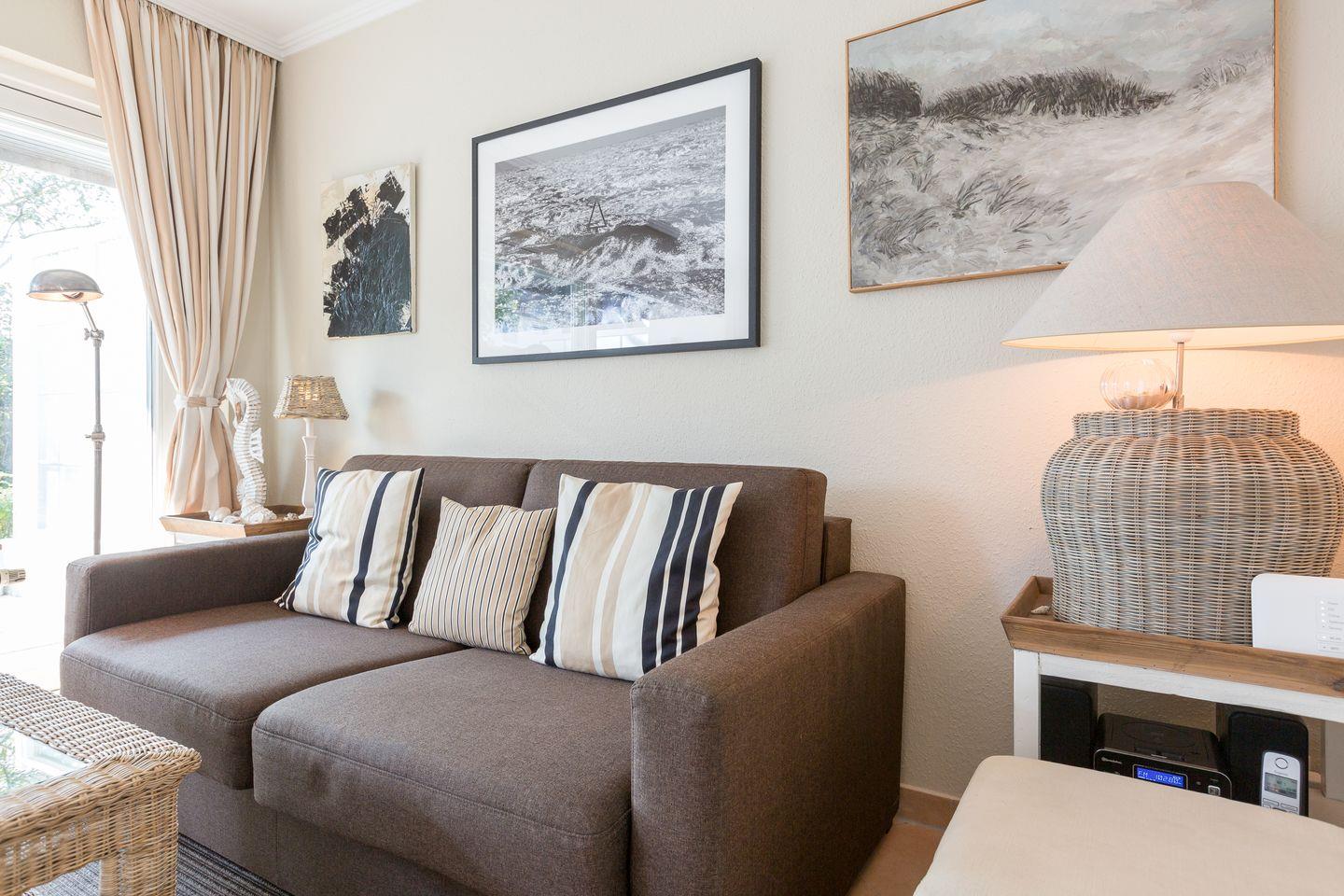 Sehr hochwertig und geschmackvoll möblierter, heller Wohnraum mit Flatscreen-TV, Stereoanlage mit Bluetooth. Separate Küche mit