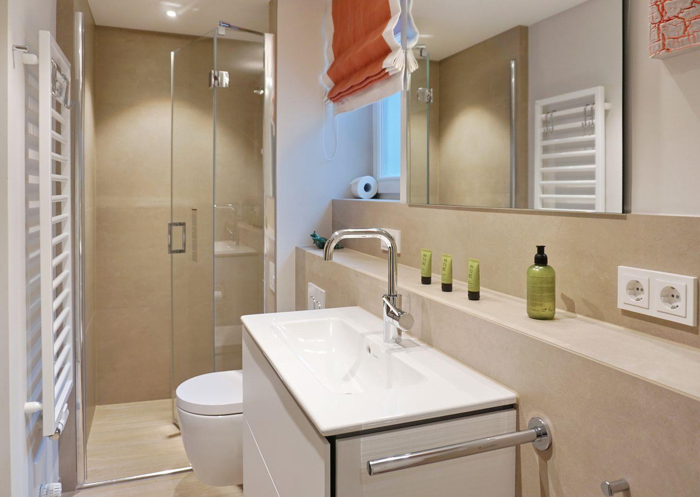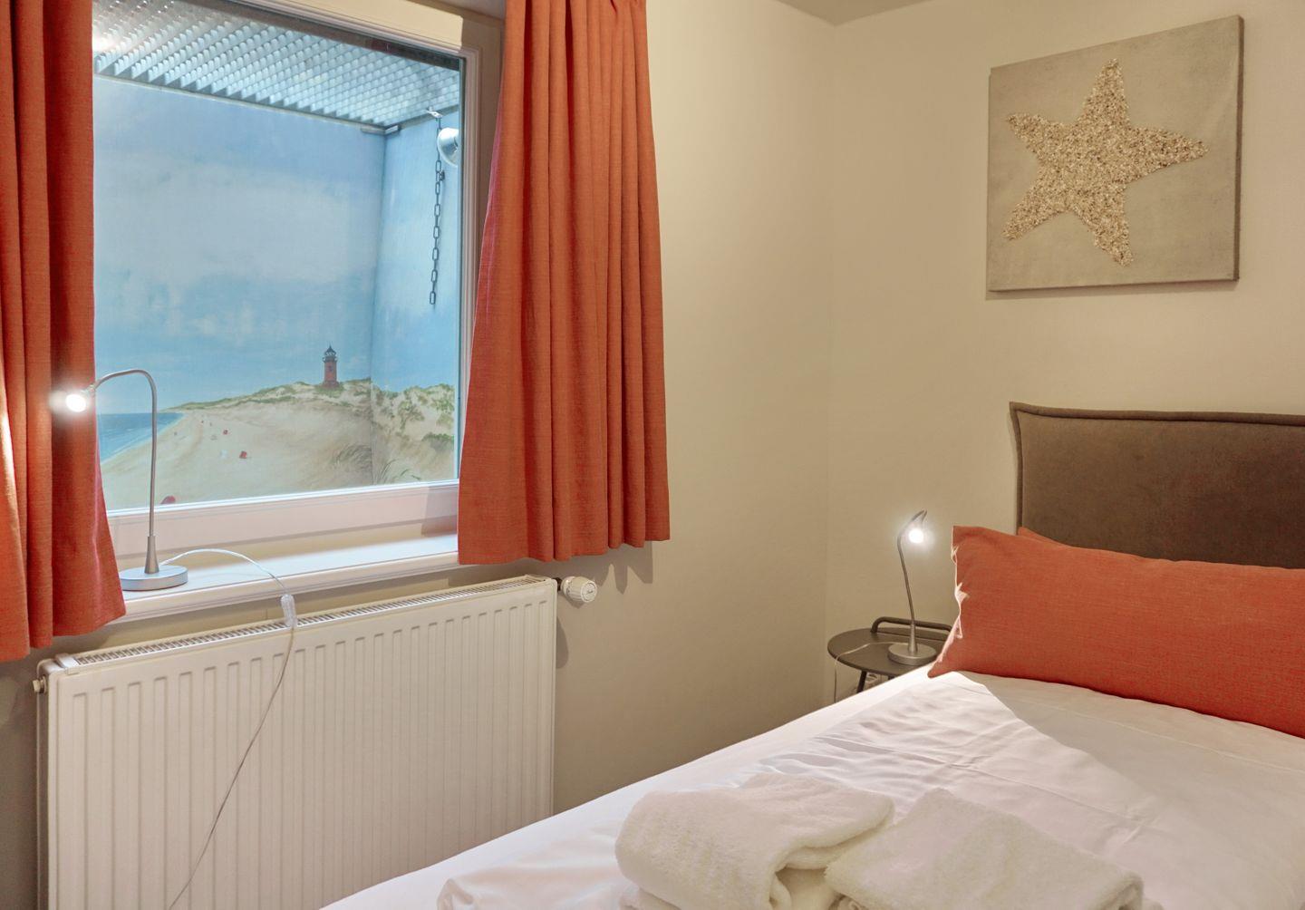 UG: 1 Raum mit Doppelbett (180x200cm) sowie 1 kleiner Schlafraum mit getrennten Betten (90x200cm). Dusche/WC. Sauna mit Dusche/WC. Waschmaschine und Trockner. Sehr attraktive und großzügige Süd-Terrasse mit Strandkorb (ca. von April–Oktober) und Gartenmöbeln. Parkplatz.