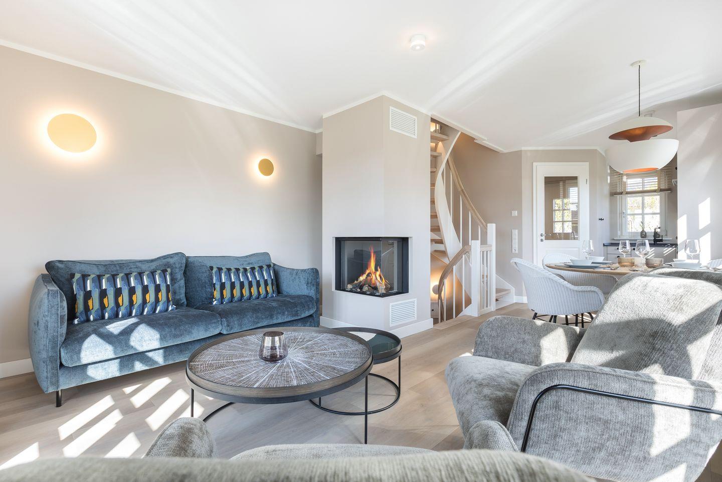 EG: Wohnraum mit Flatscreen-TV, Gaskamin, Essbereich, offene Küche mit Backofen, Induktionsherd, Spülmaschine, Filterkaffeemschine, Nespressomaschine, Gäste-WC, Garten mit einer Süd- und einer Westterrasse mit Gartenmöbeln, Sonnenschirm und zwei Strandkörben