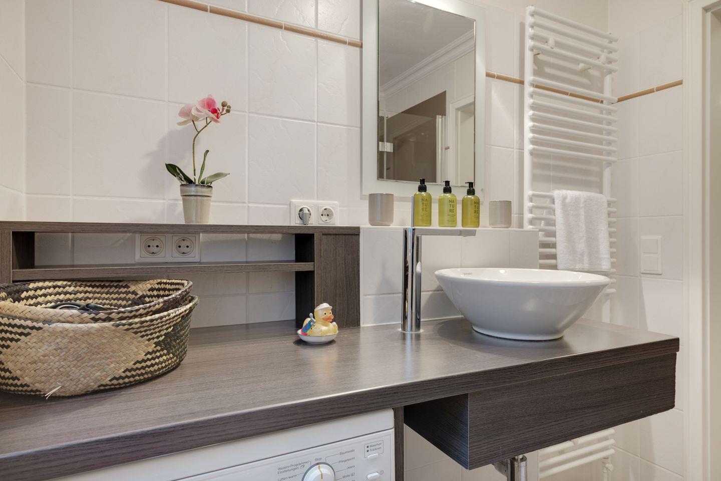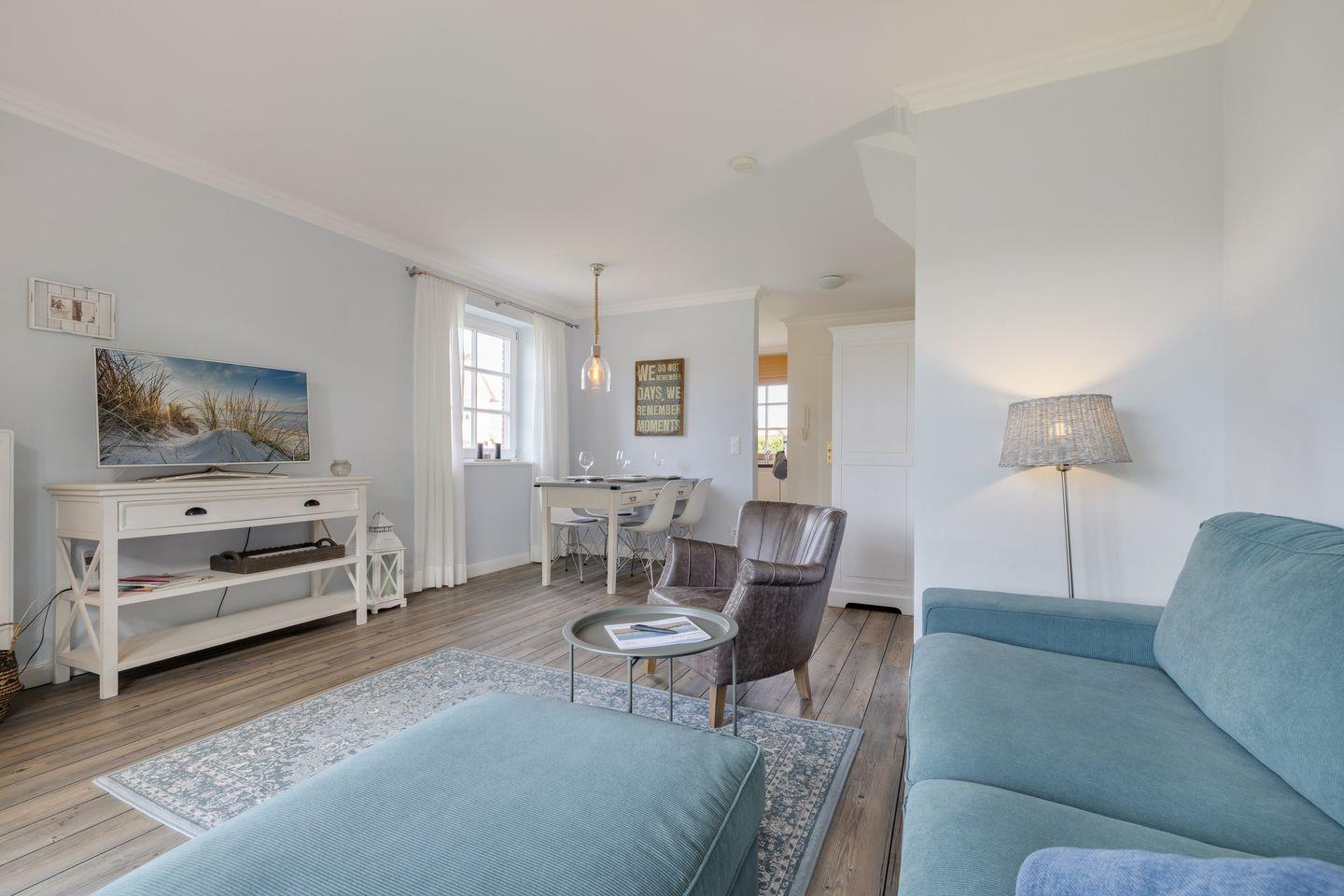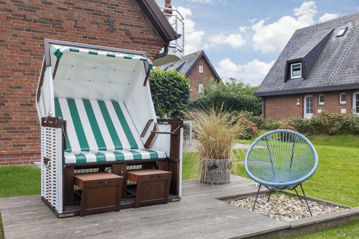 Erdgeschoss: großzügiger Wohnraum mit Kabel-TV (Flatscreen), integrierter Radiofunktion, DVD/CD-Player. Gemütlicher Esstischbereich. Separate Küche mit Geschirrspüler, Backofen, Mikrowelle und Nespressomaschine. Große Terrasse, zum Süd-Westen ausgerichtet, mit Strandkorb (ca. von April-Oktober).