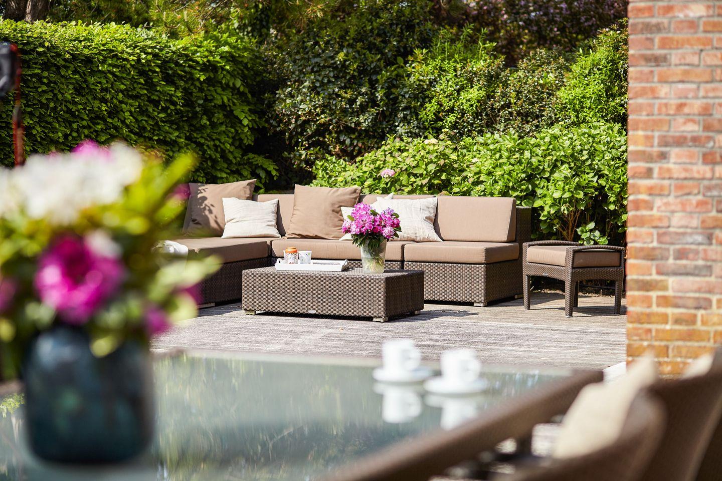 Das Erdgeschoss des Hauses empfängt Sie mit einem riesigen Wohnbereich mit zwei Sofaecken und einer offenen Küche mit angrenzendem Essbereich. Die Küche lässt mit Geschirrspüler und Gasherd keine Wünsche offen, sodass Sie sich unkompliziert Ihr Urlaubsdinner kochen können. Vom Wohnbereich aus erreichen Sie den liebevoll angelegten Garten mit mehreren möblierten Terrassen. Das Erdgeschoss bietet Ihnen außerdem ein Kinderschlafzimmer mit Doppelstockbett und eigenem Badezimmer. Zusätzlich verfügt diese Etage über ein Gäste-WC.
