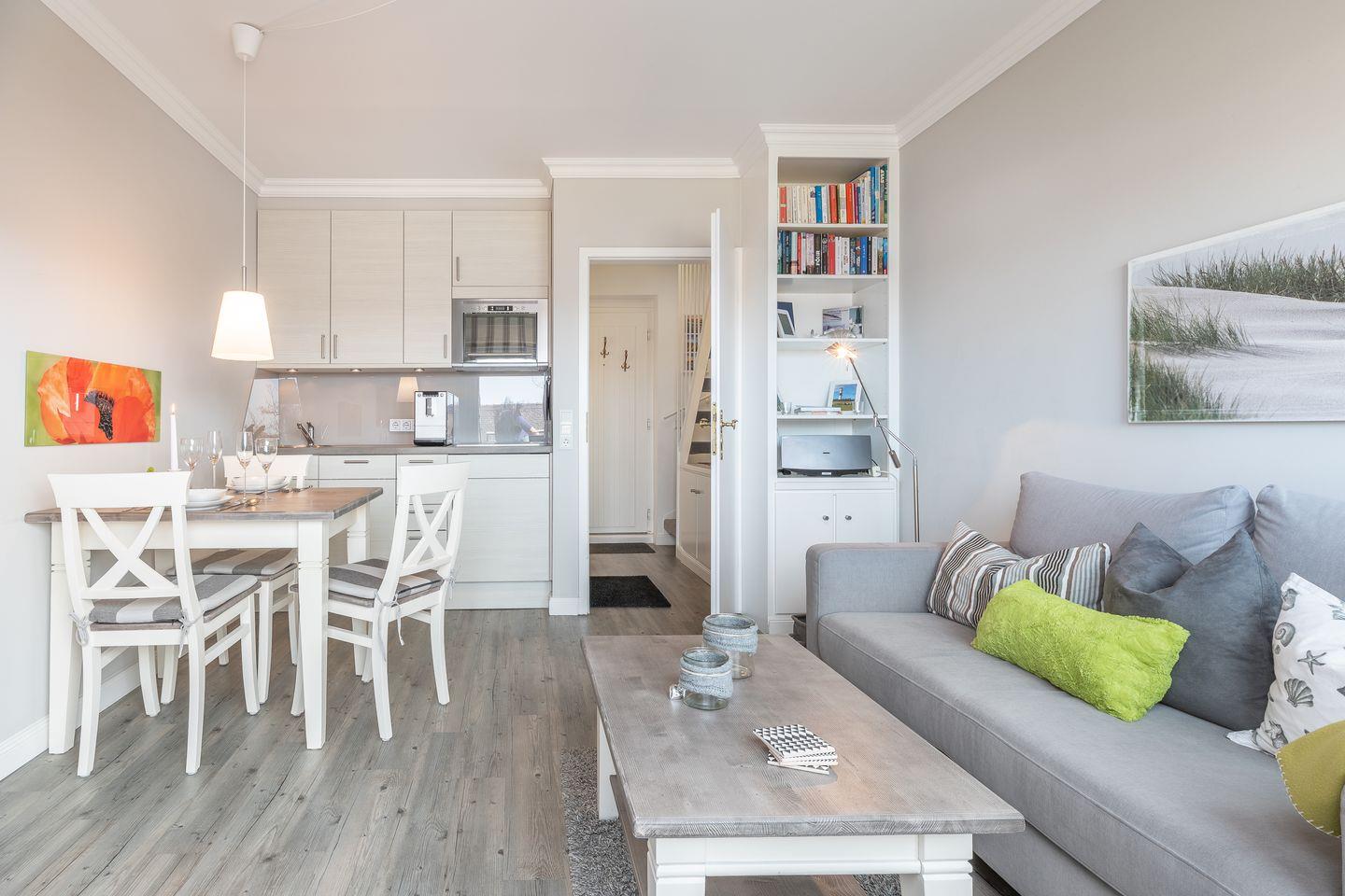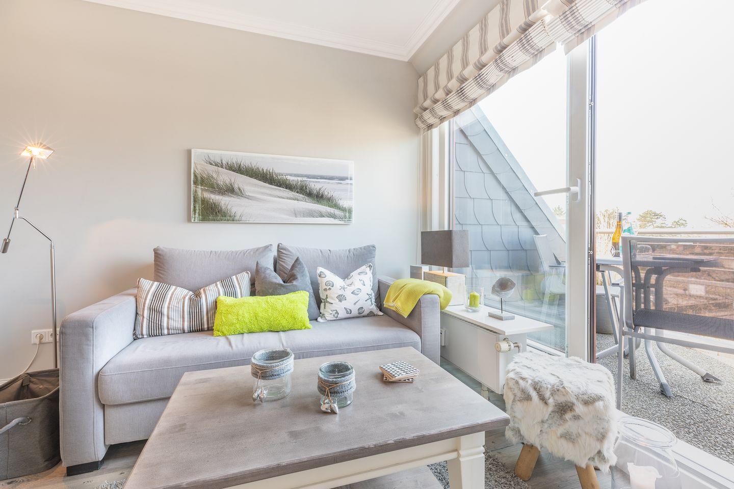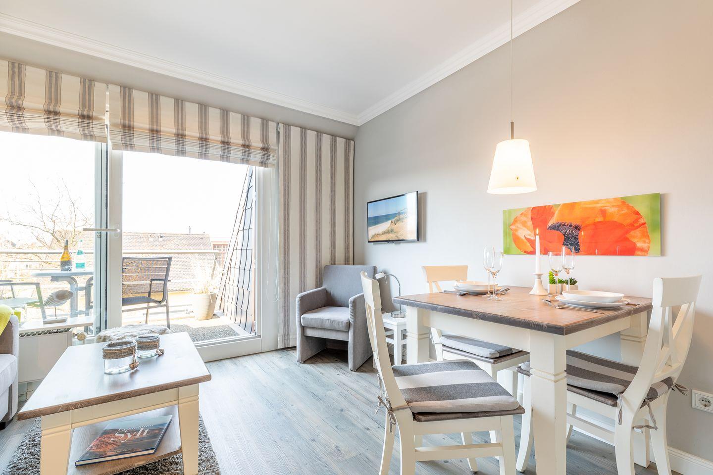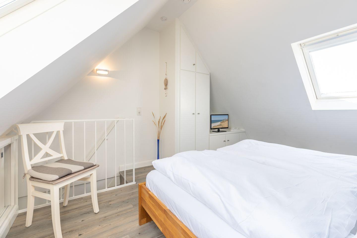 Der Wohnraum des Domizils hält für Sie eine gemütliche Couch, einen kleinen Essbereich und eine offen gestaltete Küchenzeile bereit. Sie finden hier eine Mikrowellen-Backofenkombi sowie einen Induktionsherd und sind somit für die Zubereitung Ihres Urlaubsdinners sehr gut gewappnet. Vom Wohnbereich aus betreten Sie ihren möblierten Balkon, auf dem Sie entspannt an der Nordseeluft die Seele baumeln lassen können. Auf gleicher Ebene befindet sich ein modernes Tageslichtbadezimmer mit Dusche und WC. Im Dachgeschoss der Wohnung finden Sie einen weiteren Raum mit Doppelbett (180x200) und Flatscreen-TV.