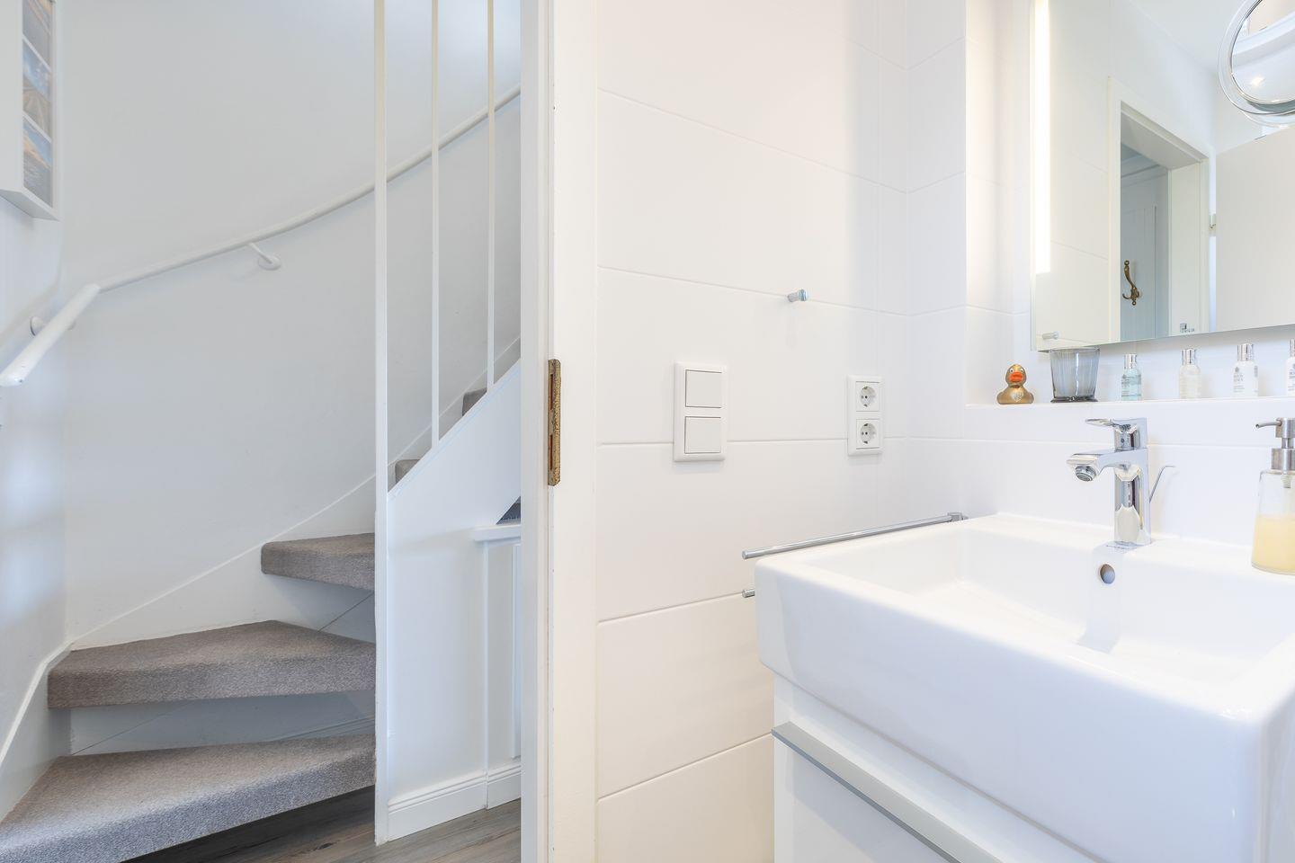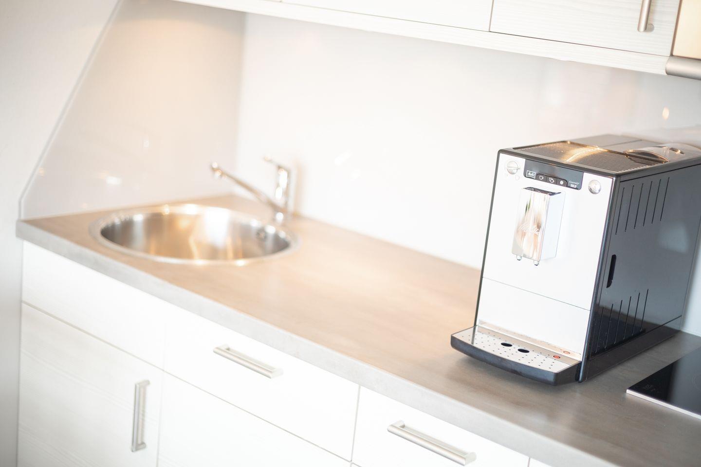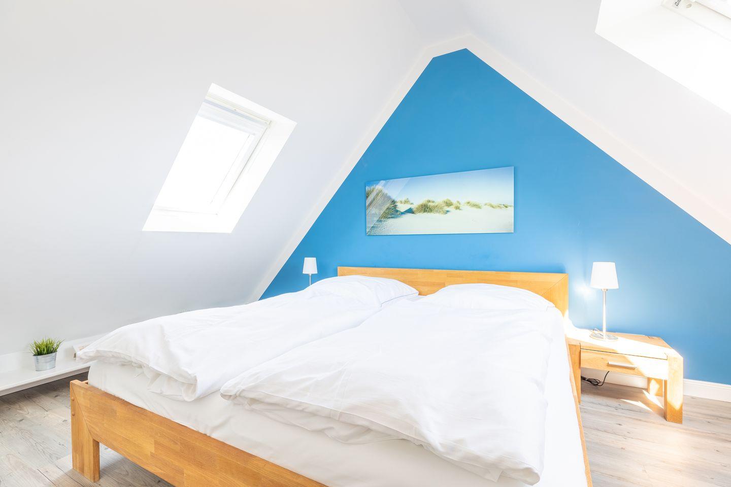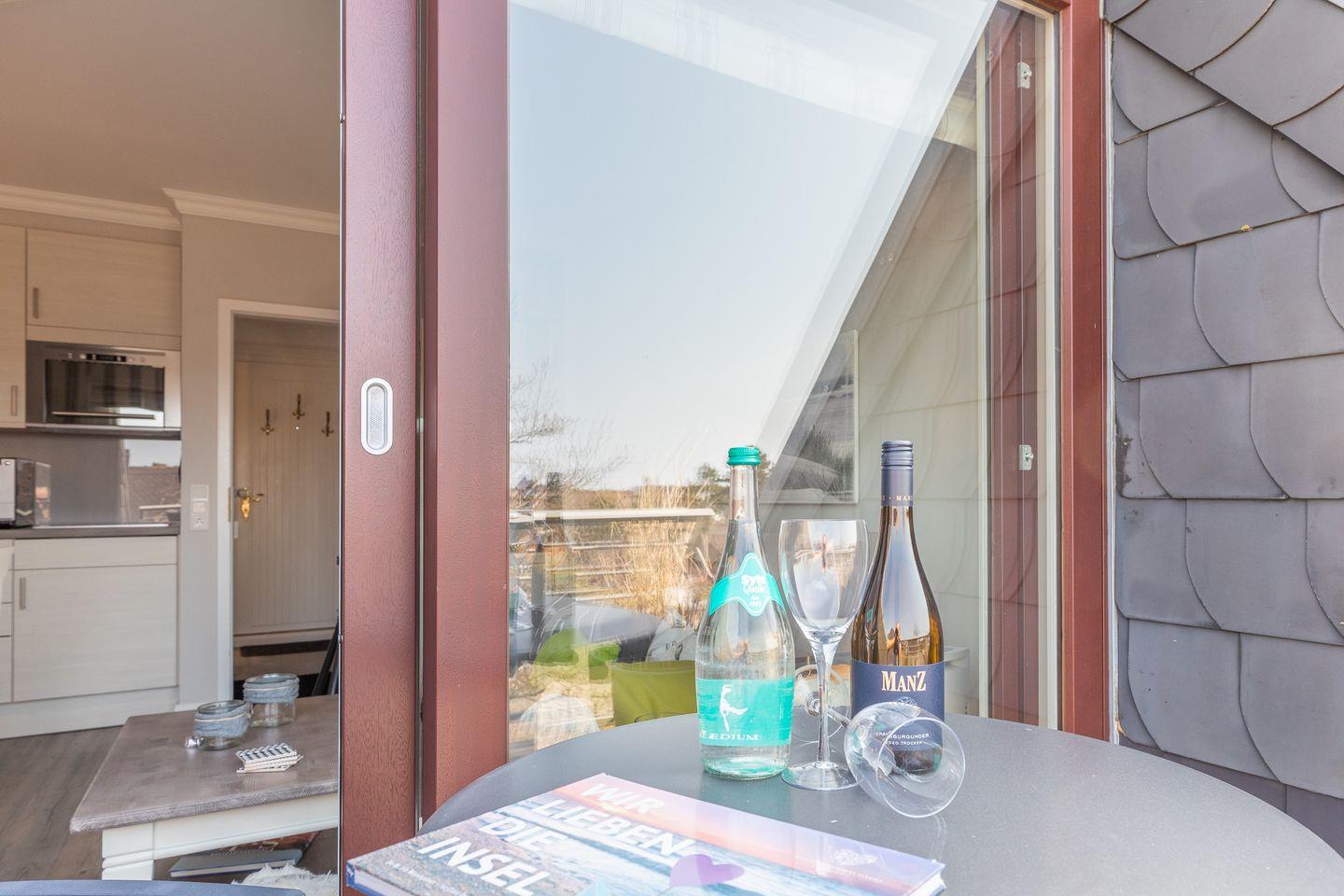 Der Wohnraum des Domizils hält für Sie eine gemütliche Couch, einen kleinen Essbereich und eine offen gestaltete Küchenzeile bereit. Sie finden hier eine Mikrowellen-Backofenkombi sowie einen Induktionsherd und sind somit für die Zubereitung Ihres Urlaubsdinners sehr gut gewappnet. Vom Wohnbereich aus betreten Sie ihren möblierten Balkon, auf dem Sie entspannt an der Nordseeluft die Seele baumeln lassen können. Auf gleicher Ebene befindet sich ein modernes Tageslichtbadezimmer mit Dusche und WC. Im Dachgeschoss der Wohnung finden Sie einen weiteren Raum mit Doppelbett (180x200) und Flatscreen-TV.