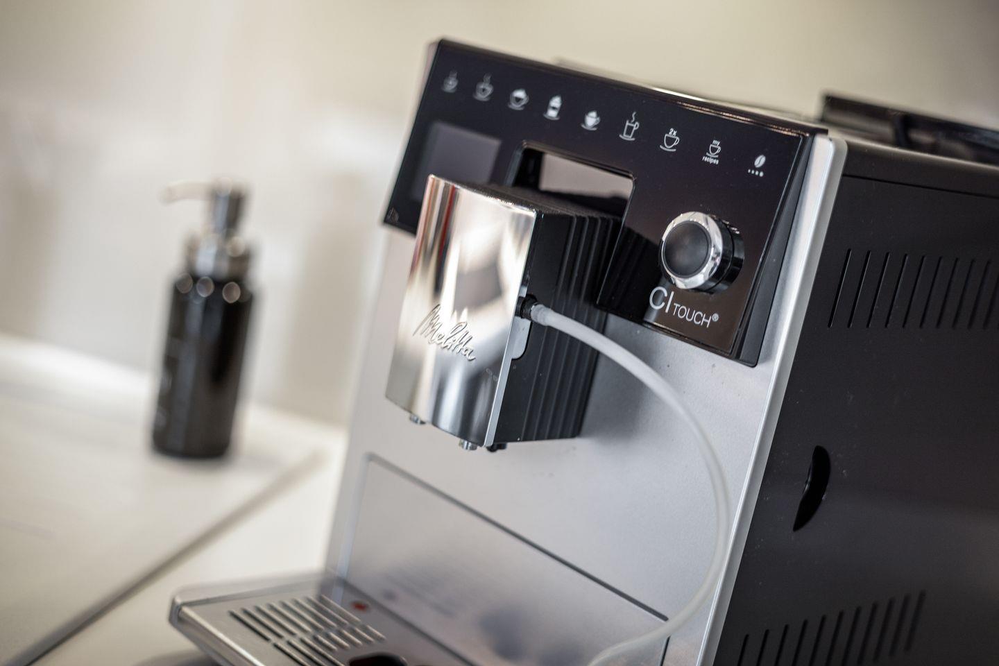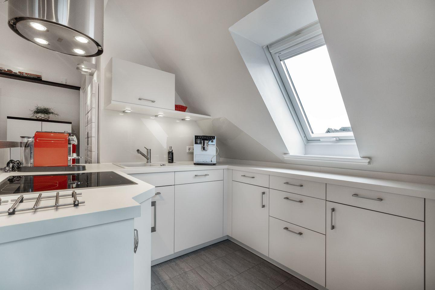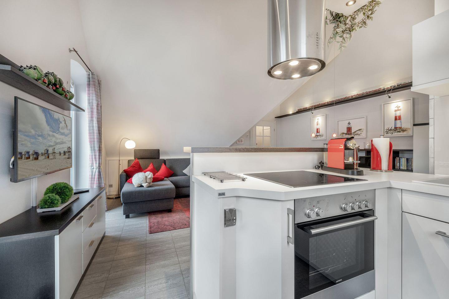 Die offene Küchenzeile ist durch einen Tresenvorbau optisch geschickt zum Wohnbereich getrennt. Gleichzeitig kann der Küchentresen auch schnell zum kommunikativen Herz, bei einem Espresso oder Latte Macchiato, avancieren. Geschirrspüler, Backofen und Microwelle finden Sie selbstverständlich in Ihrer Küche vor.
