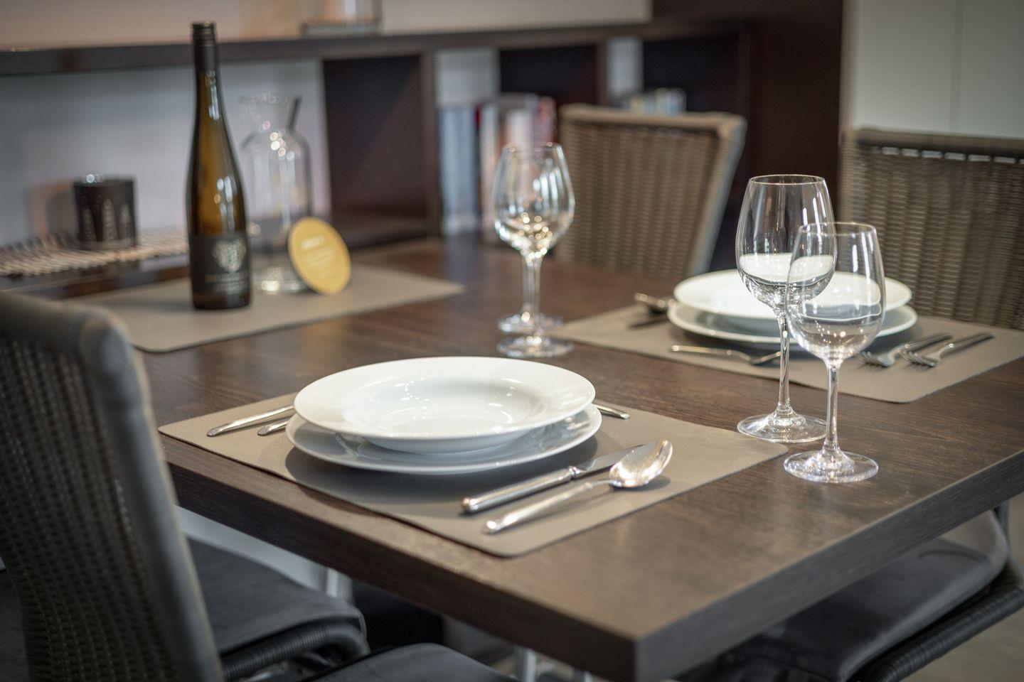Ihr Essbereich unter den Design-Pendelleuchte ist stimmig in den beeindruckenden Raum integriert und könnte sogar 4 Personen Platz bieten. Ein GIRA Unterputzradio lässt Sie beim Dinieren Ihrer Lieblings-iPod Musik lauschen.
