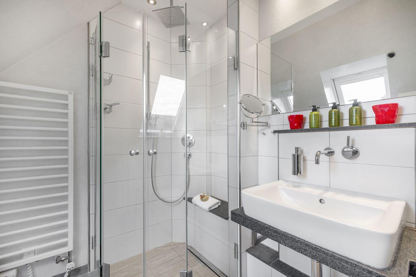 Ihr Bad ist eine kleine Wohlfühloase mit schöner Dusche samt Raindance Brause, WC und elegant gebauter Waschtischeinheit.