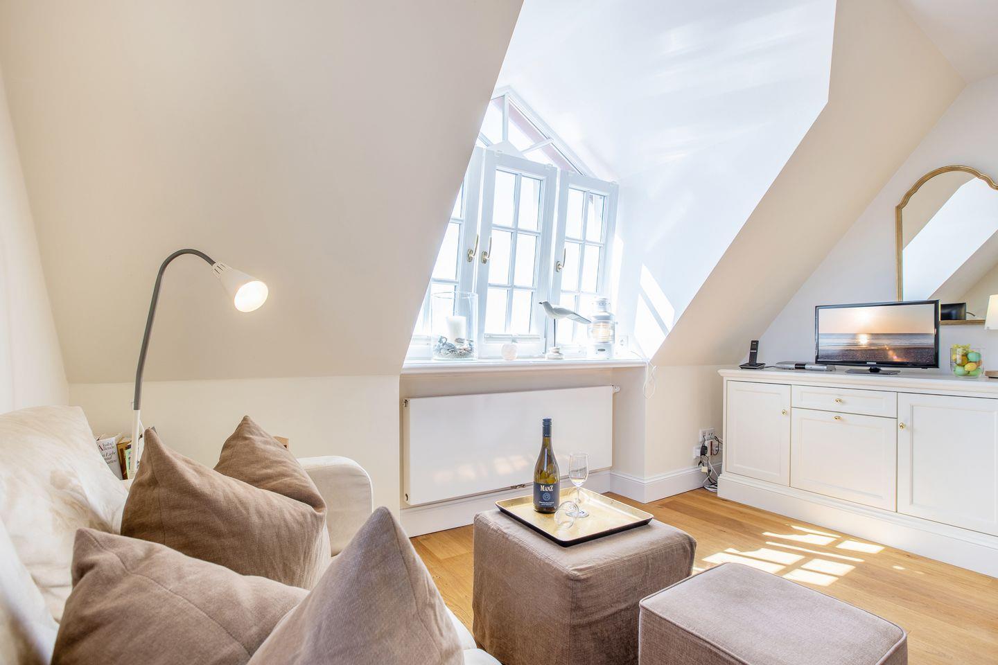 Ein lichtdurchfluteter Wohnraum erwartet Sie im Obergeschoss dieses Urlaubsdomizils mit kleiner, gemütlicher Couch, einem Essbereich für zwei Personen und einer modernen Küchenzeile mit toller Ausstattung. Auf gleicher Ebene befindet sich ein großzügiges, helles Tageslichtbadezimmer, das mit modernem Design überzeugt. Im Dachgeschoss des Appartements befindet sich ein weiterer Raum mit Doppelbett.