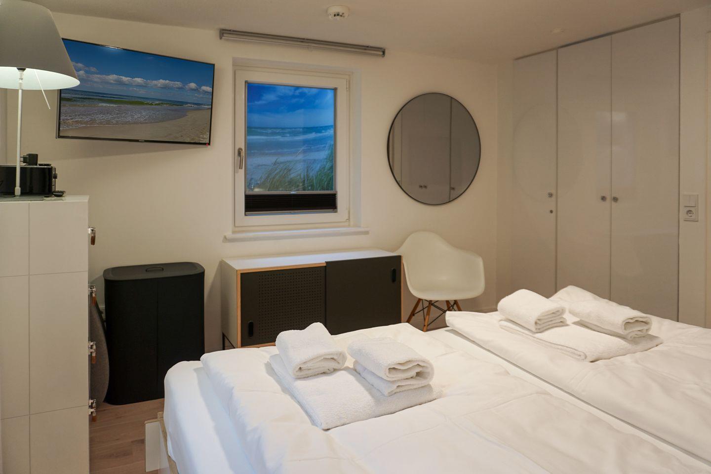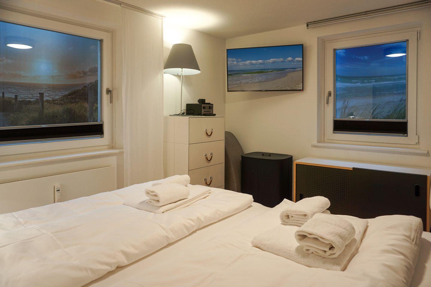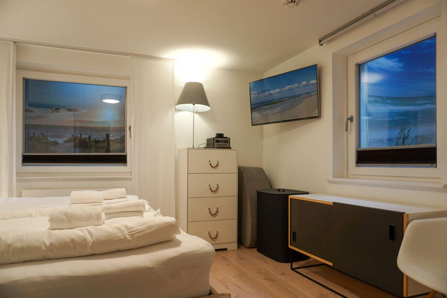 Das Schlafzimmer mit Doppelbett und Flatscreen-TV befindet sich im Untergeschoss. Direkt nebenan finden Sie ein modernes Badezimmer mit großer Dusche und WC.
