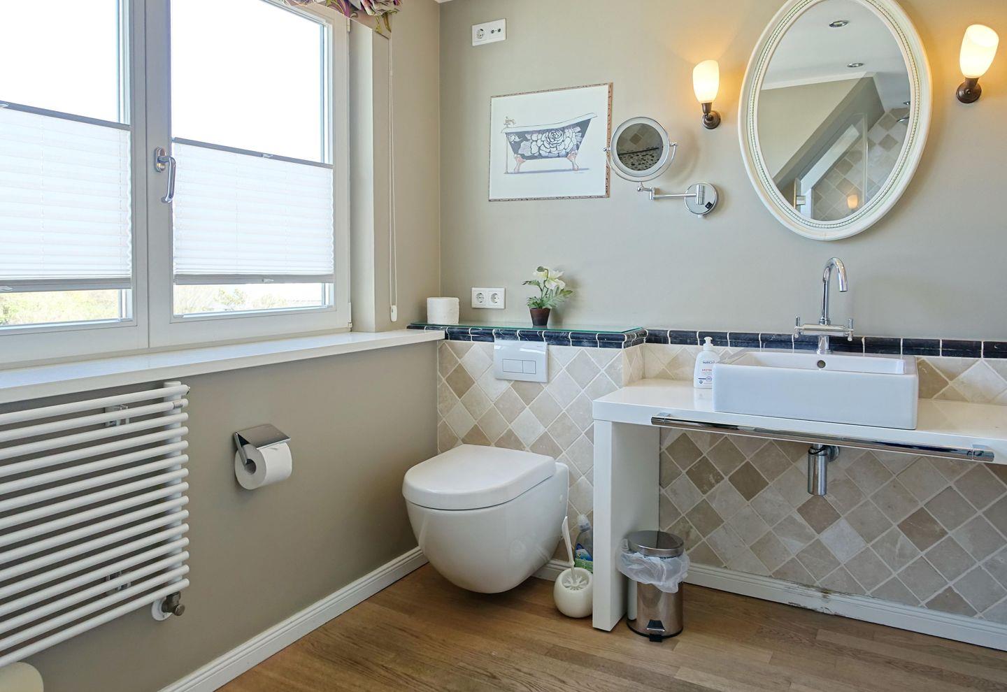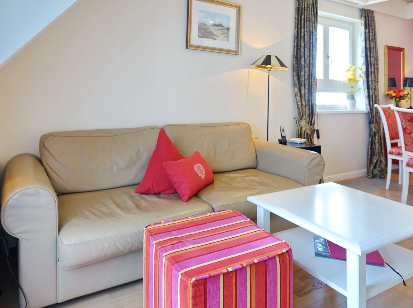 OG: Wohnraum mit TV, W-Lan, Essbereich, offene Küche mit Backofen, Geschirrspüler, Toaster, Filterkaffeemaschine, Wasserkocher, Kochfeld. Zwei Balkone mit Gartenmöbeln (April-Oktober).