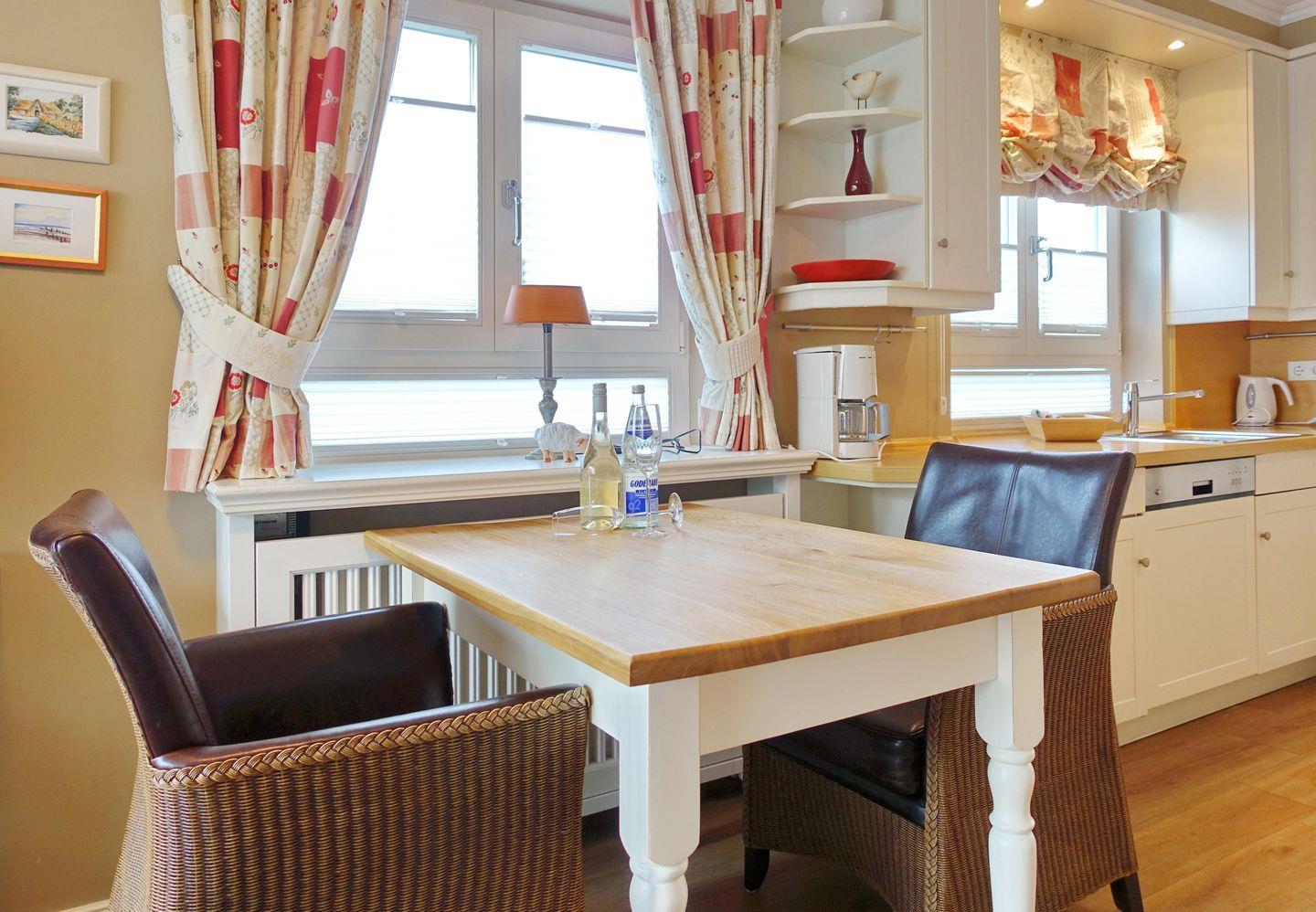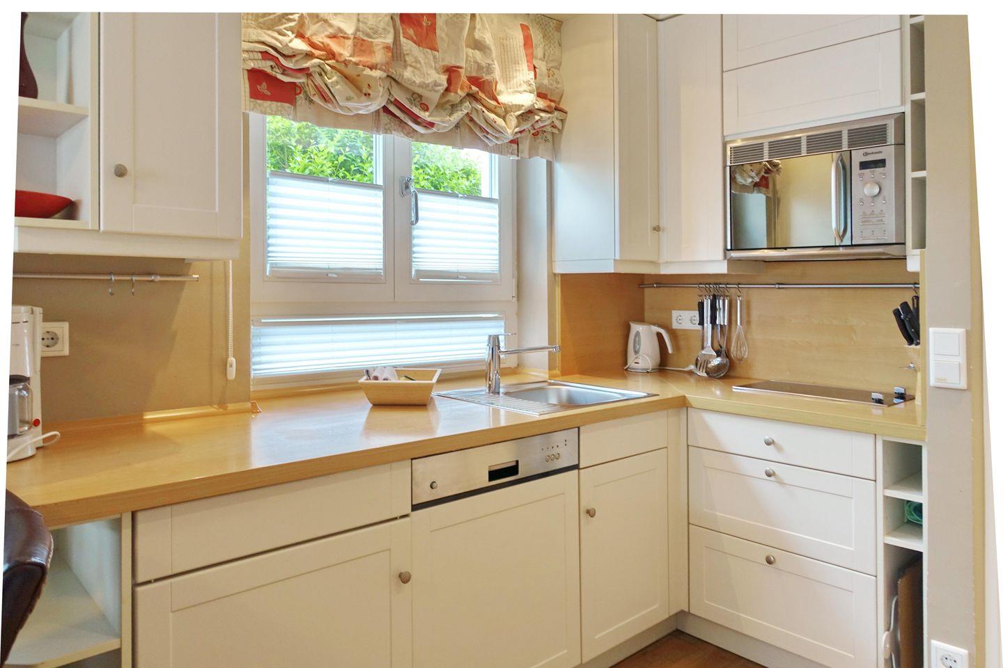 EG: Wohnraum mit TV, W-Lan, Essbereich, Küchenzeile mit Geschirrspüler, Microwelle, kleines Kochfeld, Terrasse mit Gartenmöbeln und Strandkorb (April-Oktober). Gäste-WC.