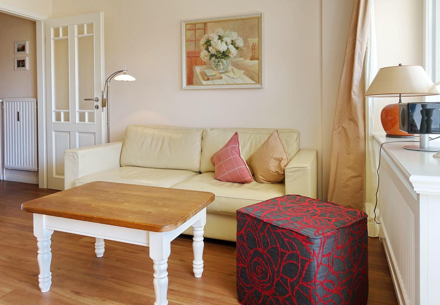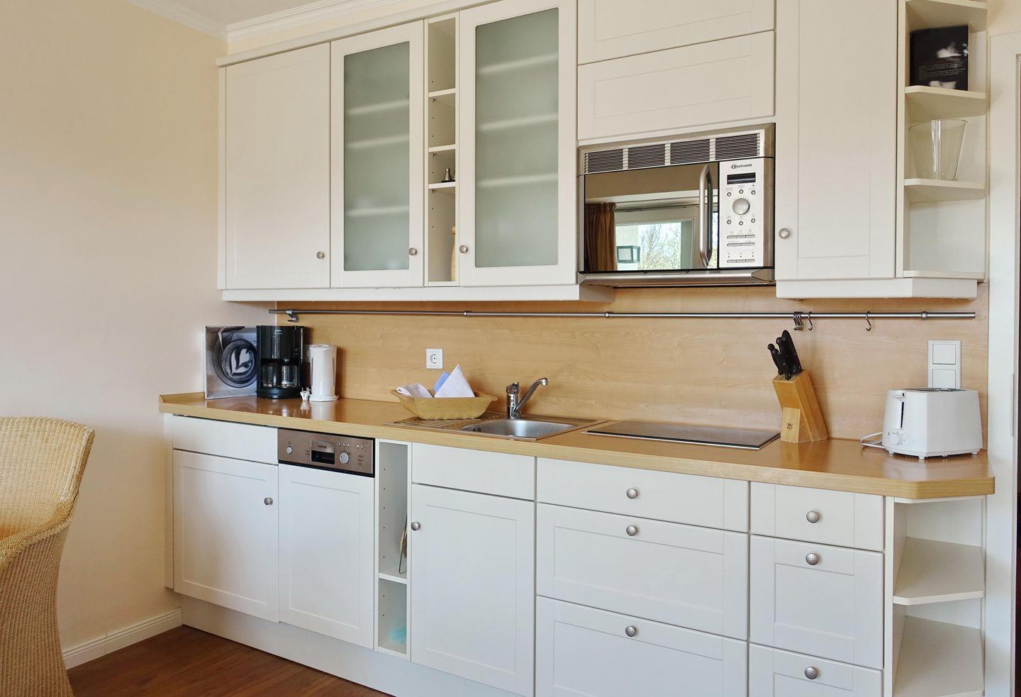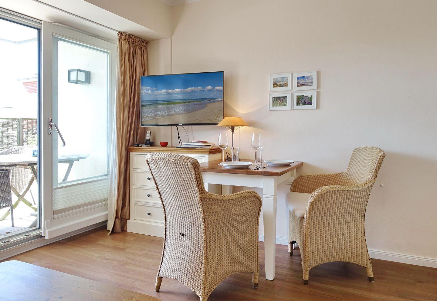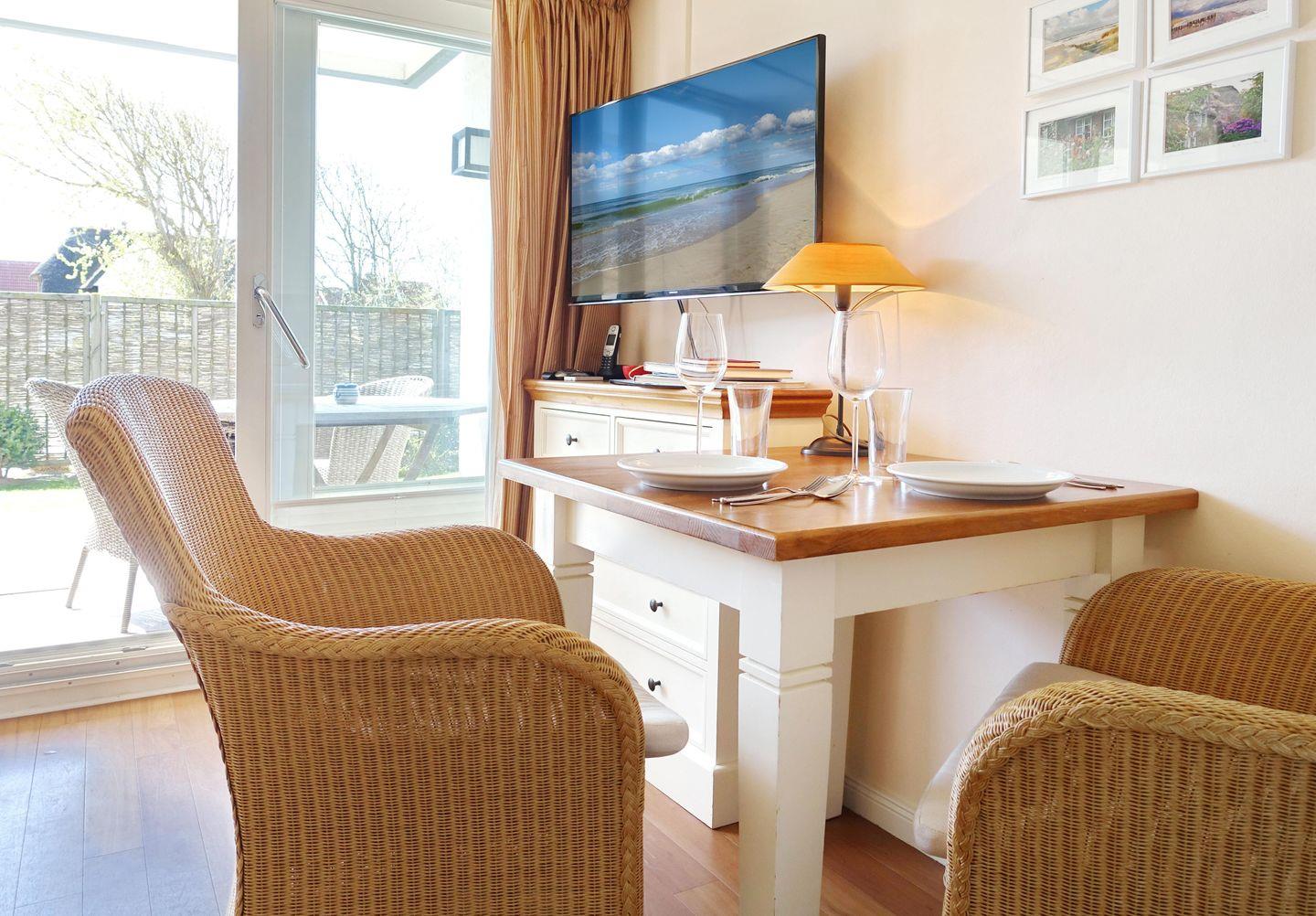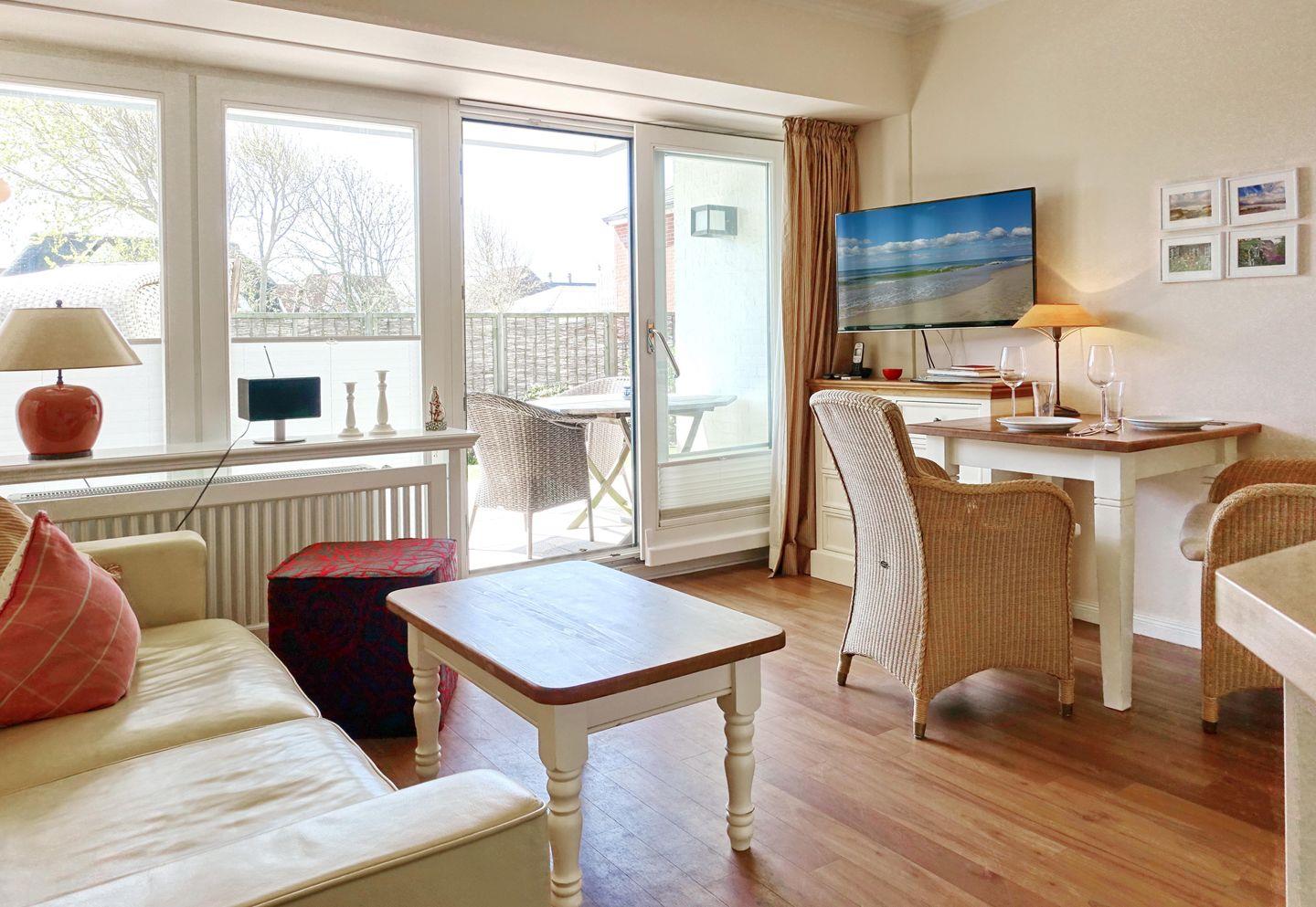 EG: Wohnraum mit TV, W-Lan, Essbereich, Küchenzeile mit Geschirrspüler, Microwelle, kleines Kochfeld, Terrasse mit Gartenmöbeln und Strandkorb (April-Oktober). Gäste-WC