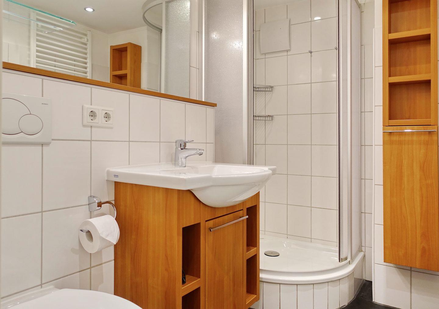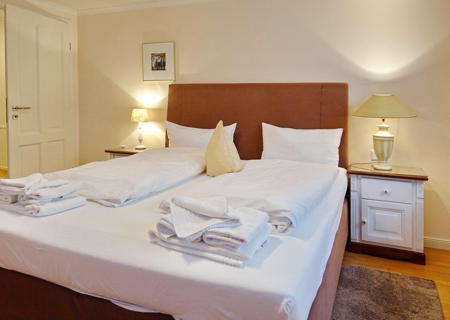 UG: Ein Raum mit Doppelbett (180 x 200 cm) und TV. Badezimmer mit Dusche und WC.