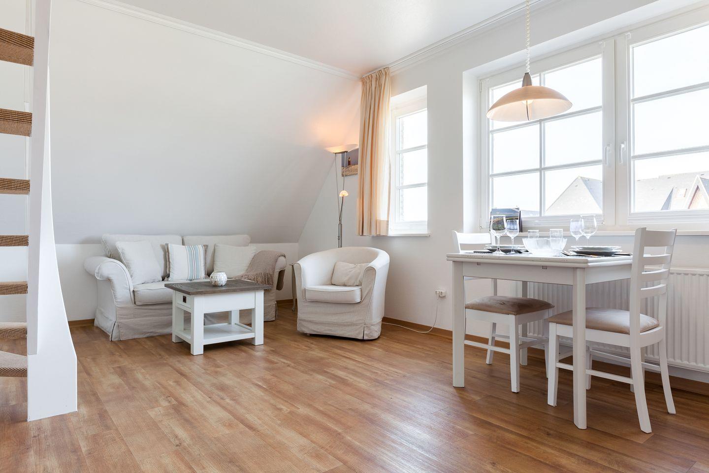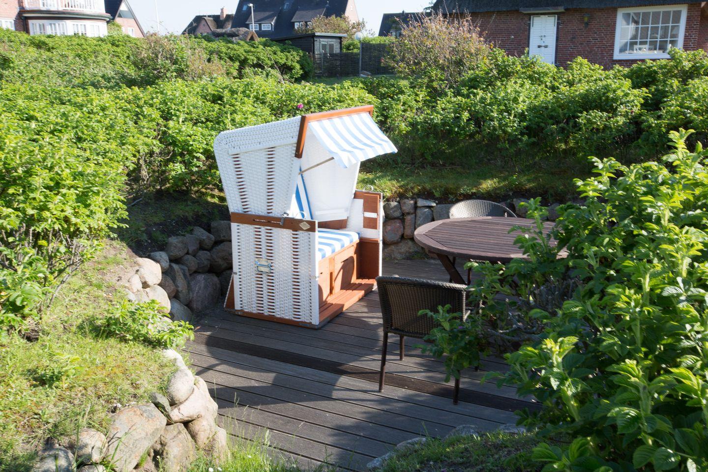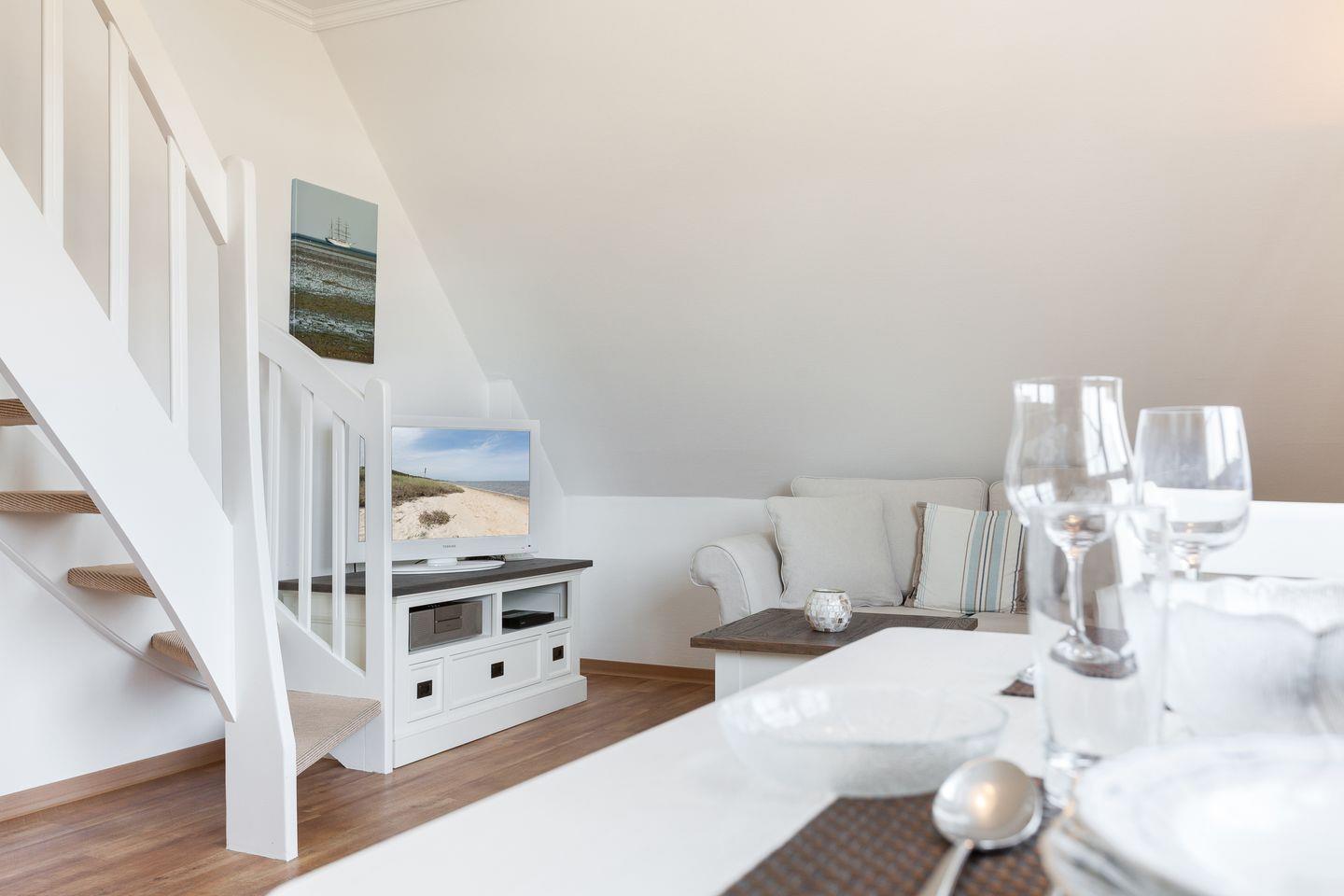 OG: Wohnraum mit Flatscreen-TV, iPod-Dockingstation, Radio, DVD-Player, CD-Player, integrierte Küchenzeile mit Geschirrspüler und Espressomaschine, Dusche/WCm, Terrasse mit Gartenmöbeln und Strandkorb (ca. Apr. - Okt.)