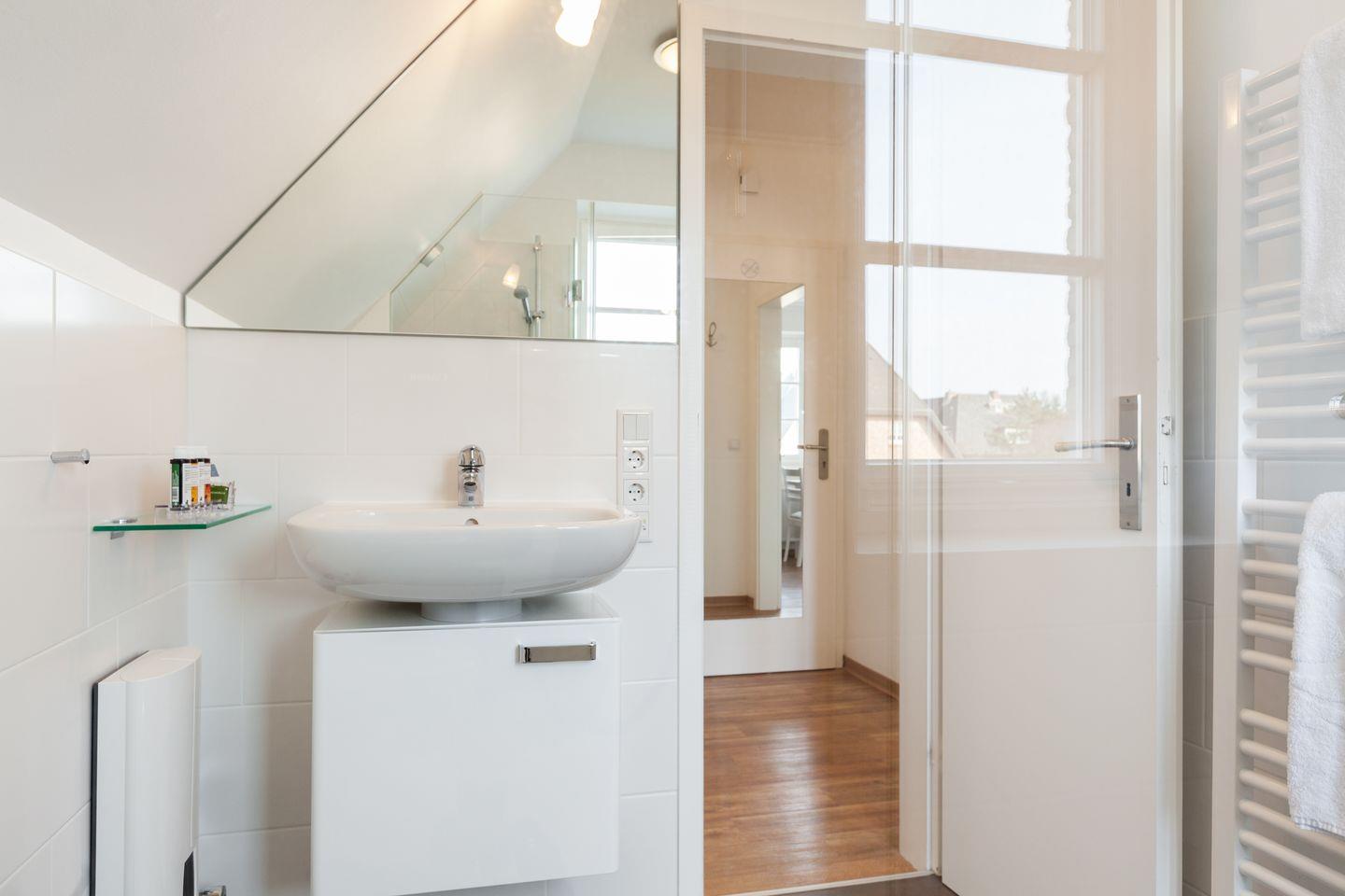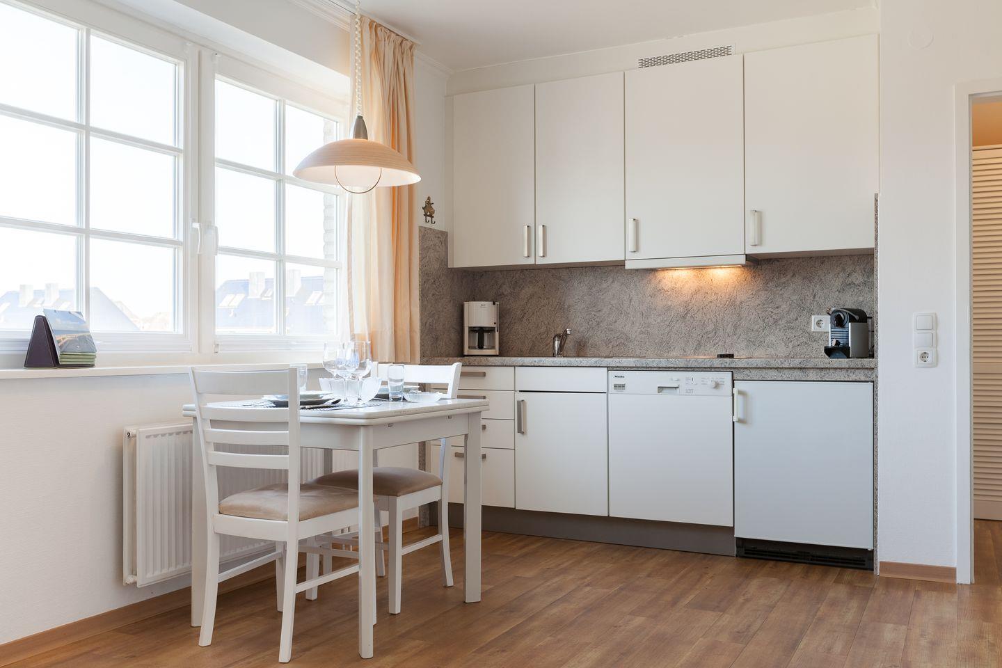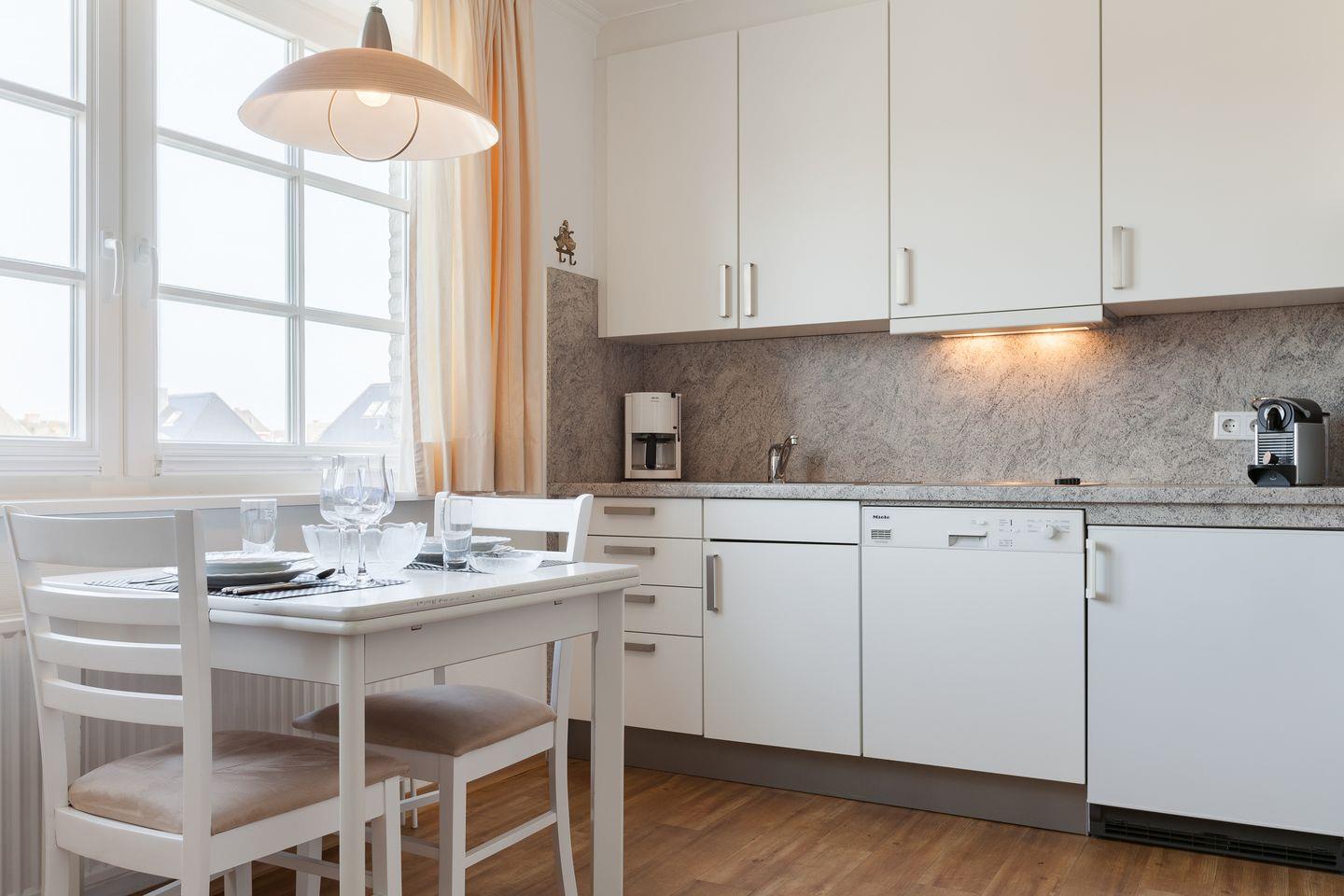 OG: Wohnraum mit Flatscreen-TV, iPod-Dockingstation, Radio, DVD-Player, CD-Player, integrierte Küchenzeile mit Geschirrspüler und Espressomaschine, Dusche/WCm, Terrasse mit Gartenmöbeln und Strandkorb (ca. Apr. - Okt.)