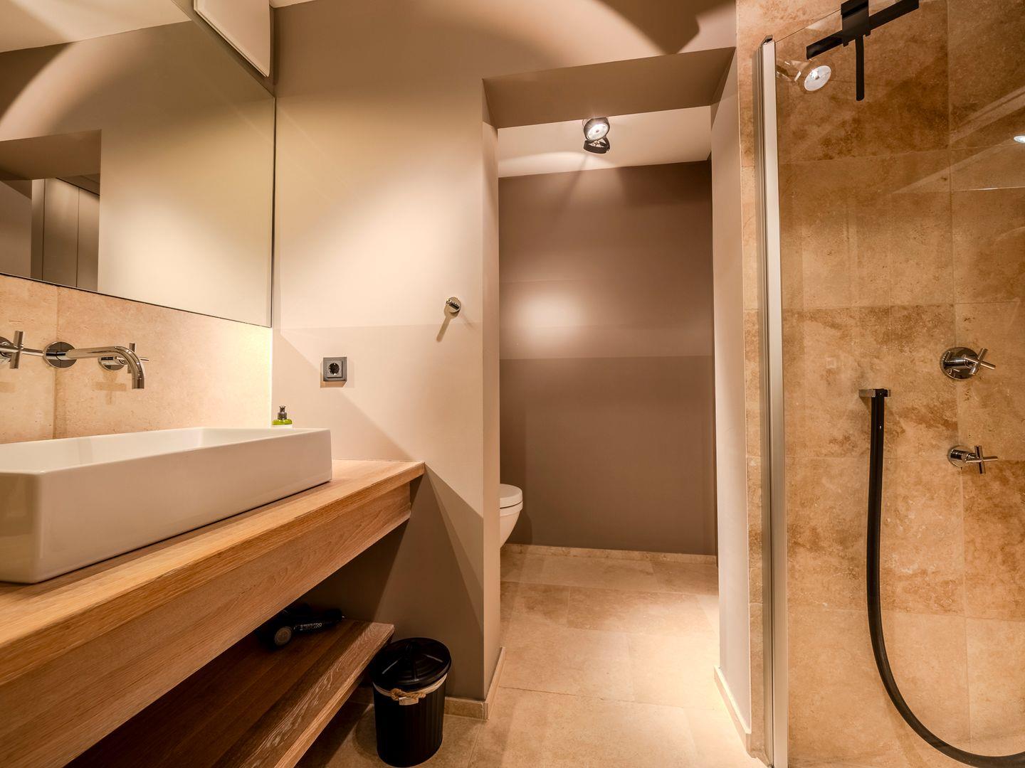 Zwei Badezimmer mit bodengleicher Regendusche, Handtuchtrockner. Eines der Badezimmer verfügt zusätzlich über eine freistehende Badewanne, Radio und Meerblick.