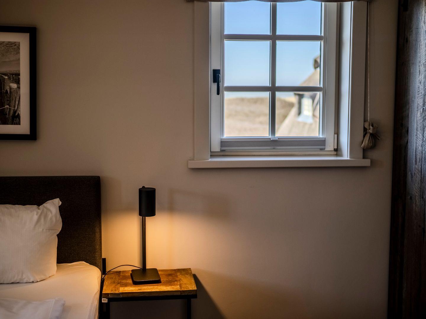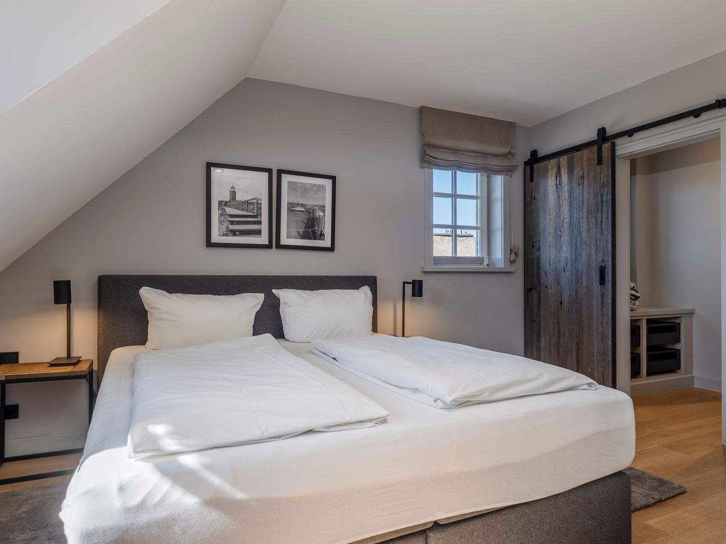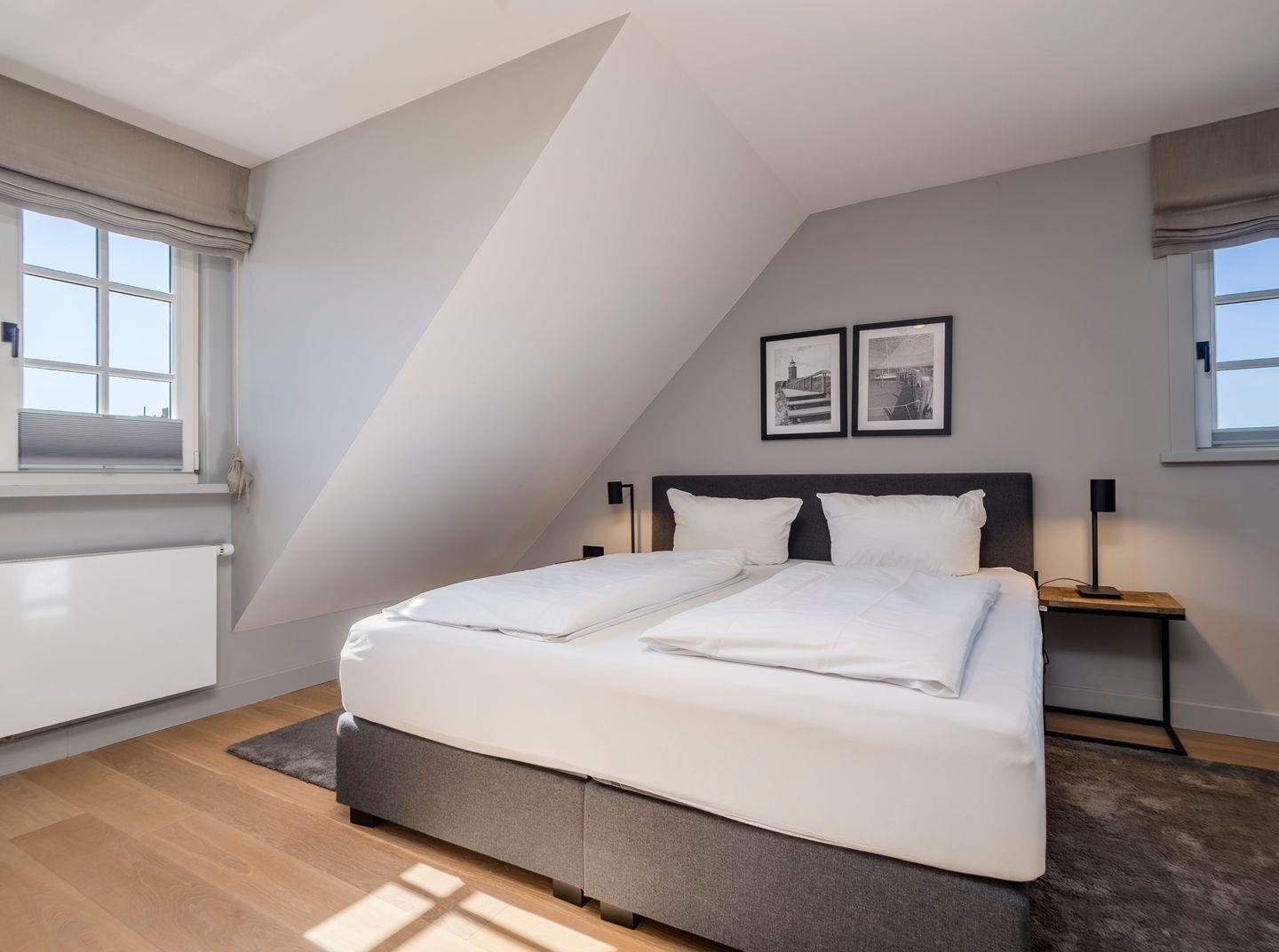 Zwei Doppelschlafzimmer und ein Schlafzimmer mit zwei Einzelbetten (80 cm x 200 cm/unter Dachschrägen - steile Treppe), die sich auch mittig zusammenstellen lassen. Alle Schlafzimmer verfügen über ein TV-Gerät, Hotelsafe, Verdunkelungsmöglichkeiten für die Fenster und Stauraum in Form von Kommoden, Garderoben oder Einbauschränken für Kleidung und persönliche Dinge. Das größte Schlafzimmer bietet einen kleinen Schreibbereich, der auch mobiles Arbeiten im Urlaub ermöglicht, einen begehbaren Kleiderschrank und Meerblick.