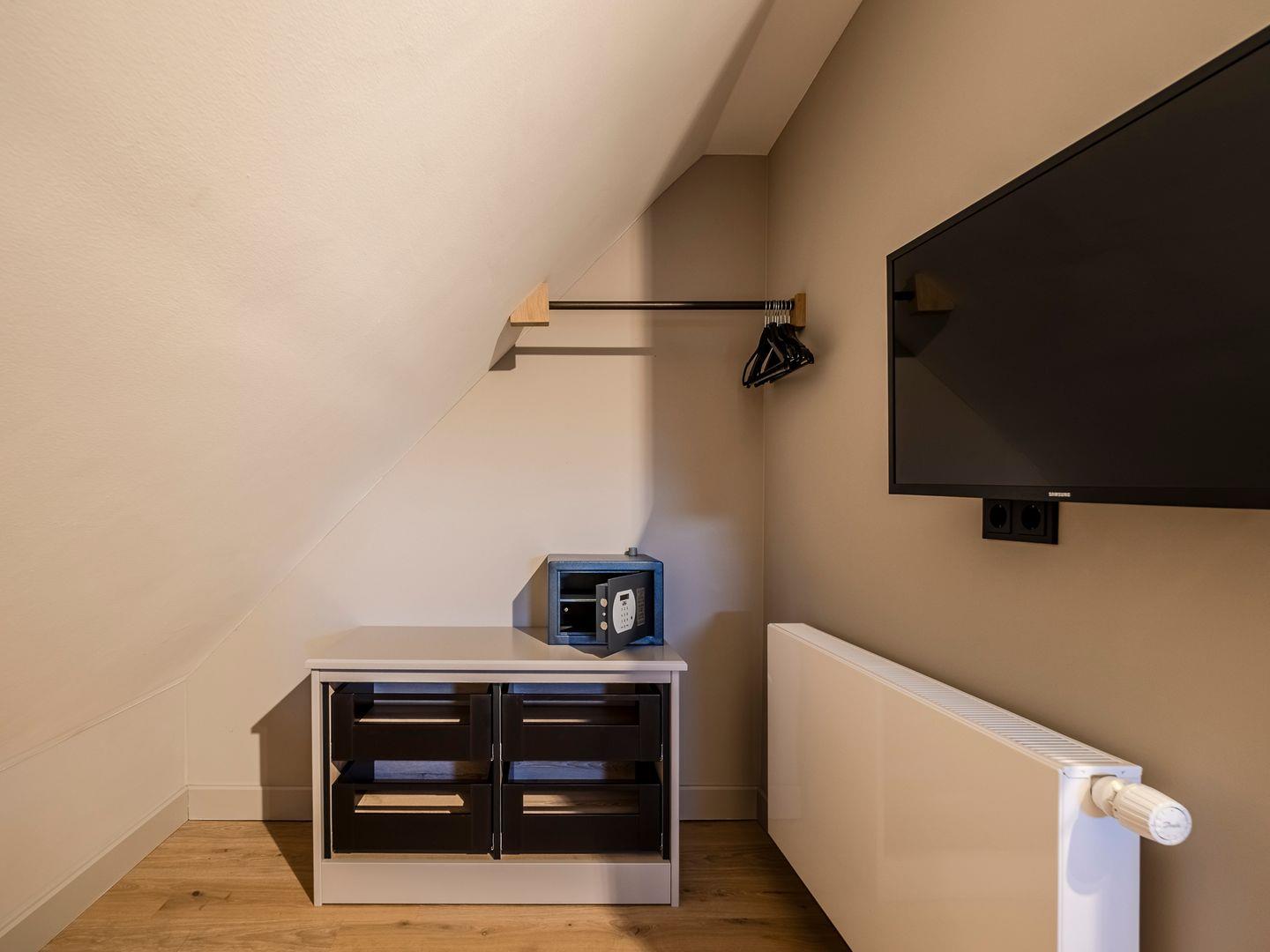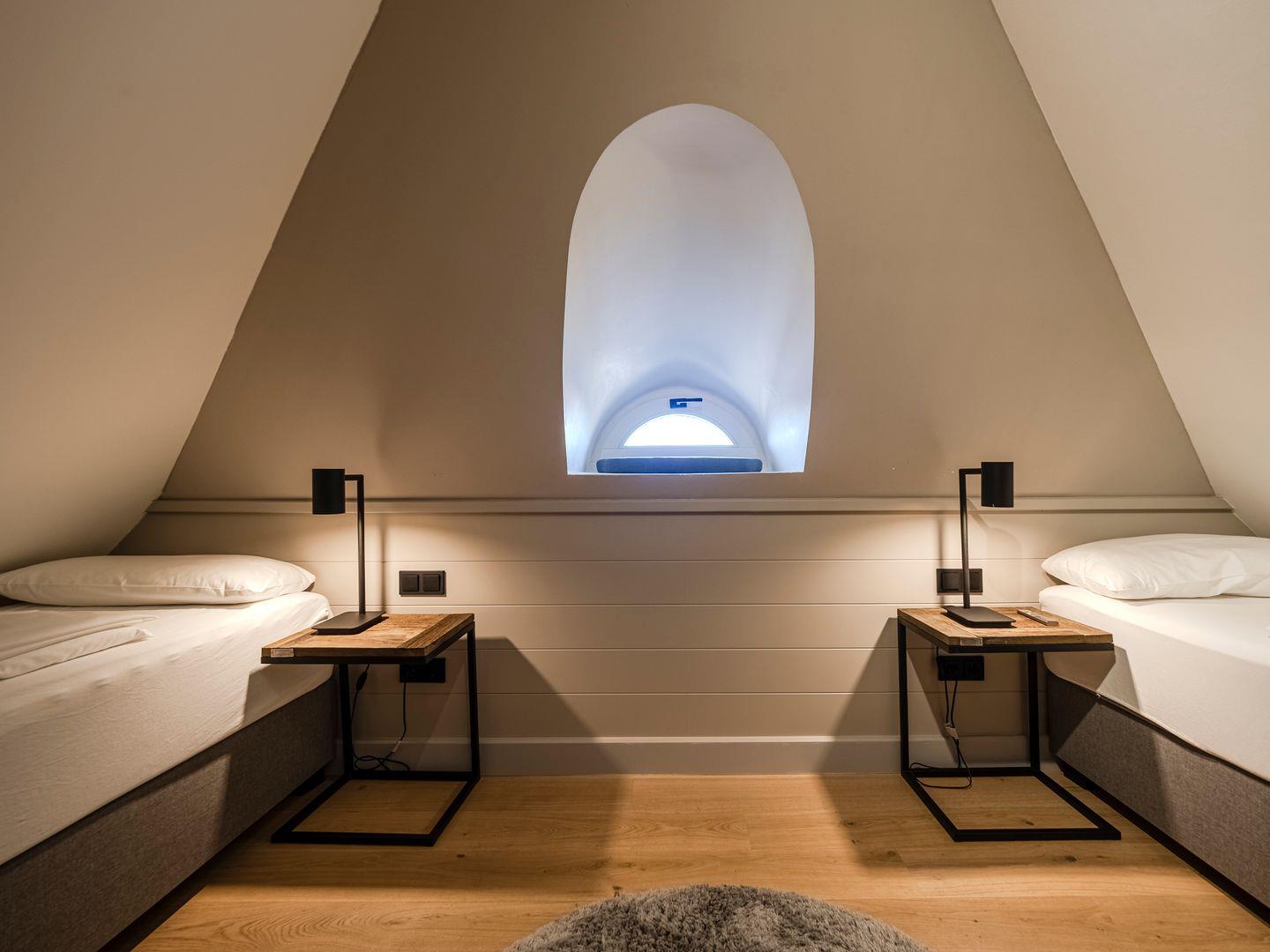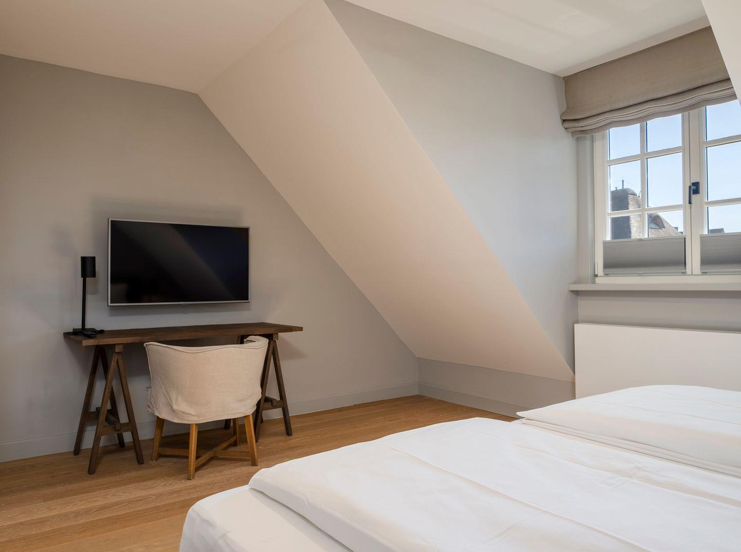 Zwei Doppelschlafzimmer und ein Schlafzimmer mit zwei Einzelbetten (80 cm x 200 cm/unter Dachschrägen - steile Treppe), die sich auch mittig zusammenstellen lassen. Alle Schlafzimmer verfügen über ein TV-Gerät, Hotelsafe, Verdunkelungsmöglichkeiten für die Fenster und Stauraum in Form von Kommoden, Garderoben oder Einbauschränken für Kleidung und persönliche Dinge. Das größte Schlafzimmer bietet einen kleinen Schreibbereich, der auch mobiles Arbeiten im Urlaub ermöglicht, einen begehbaren Kleiderschrank und Meerblick.