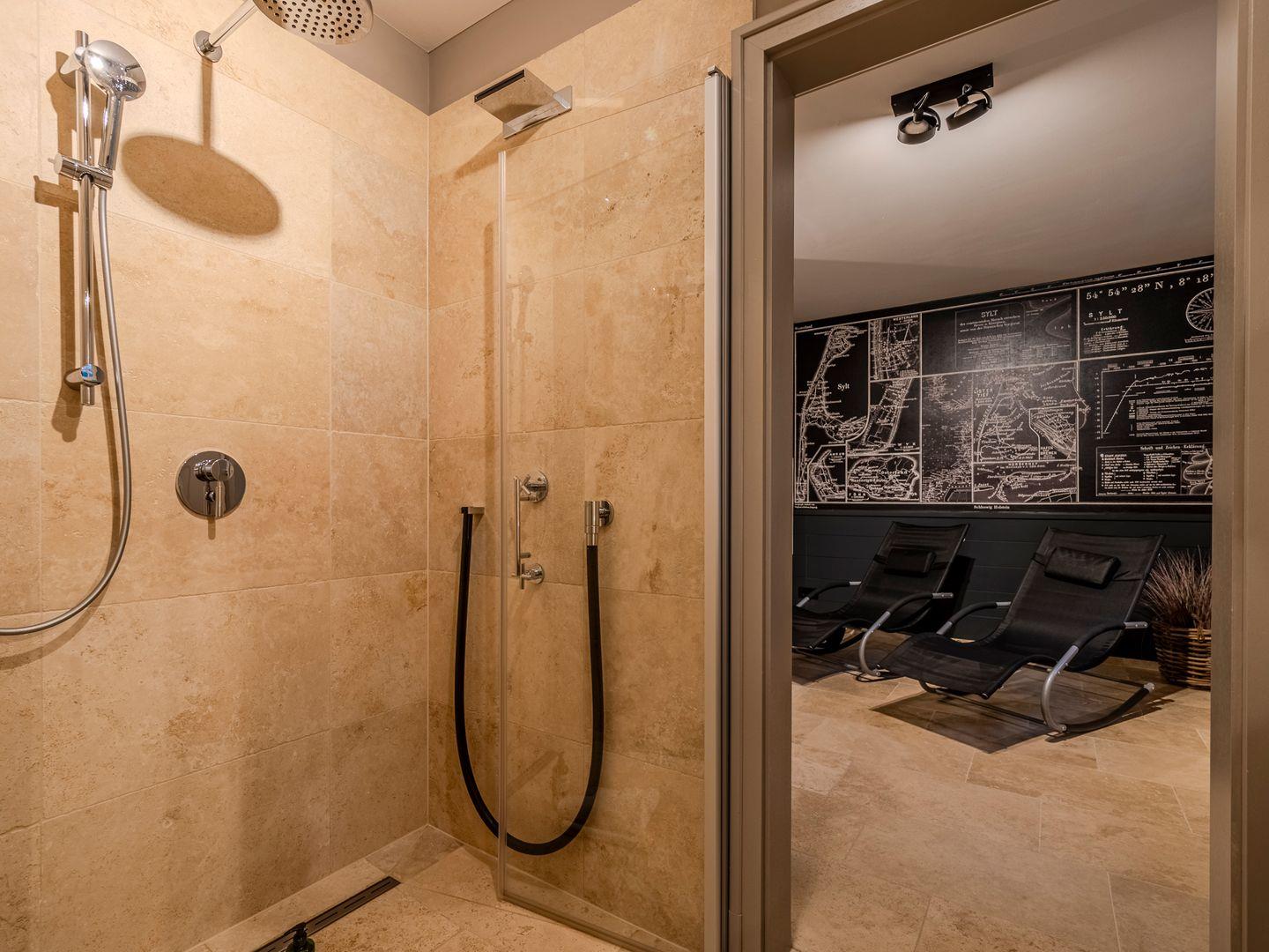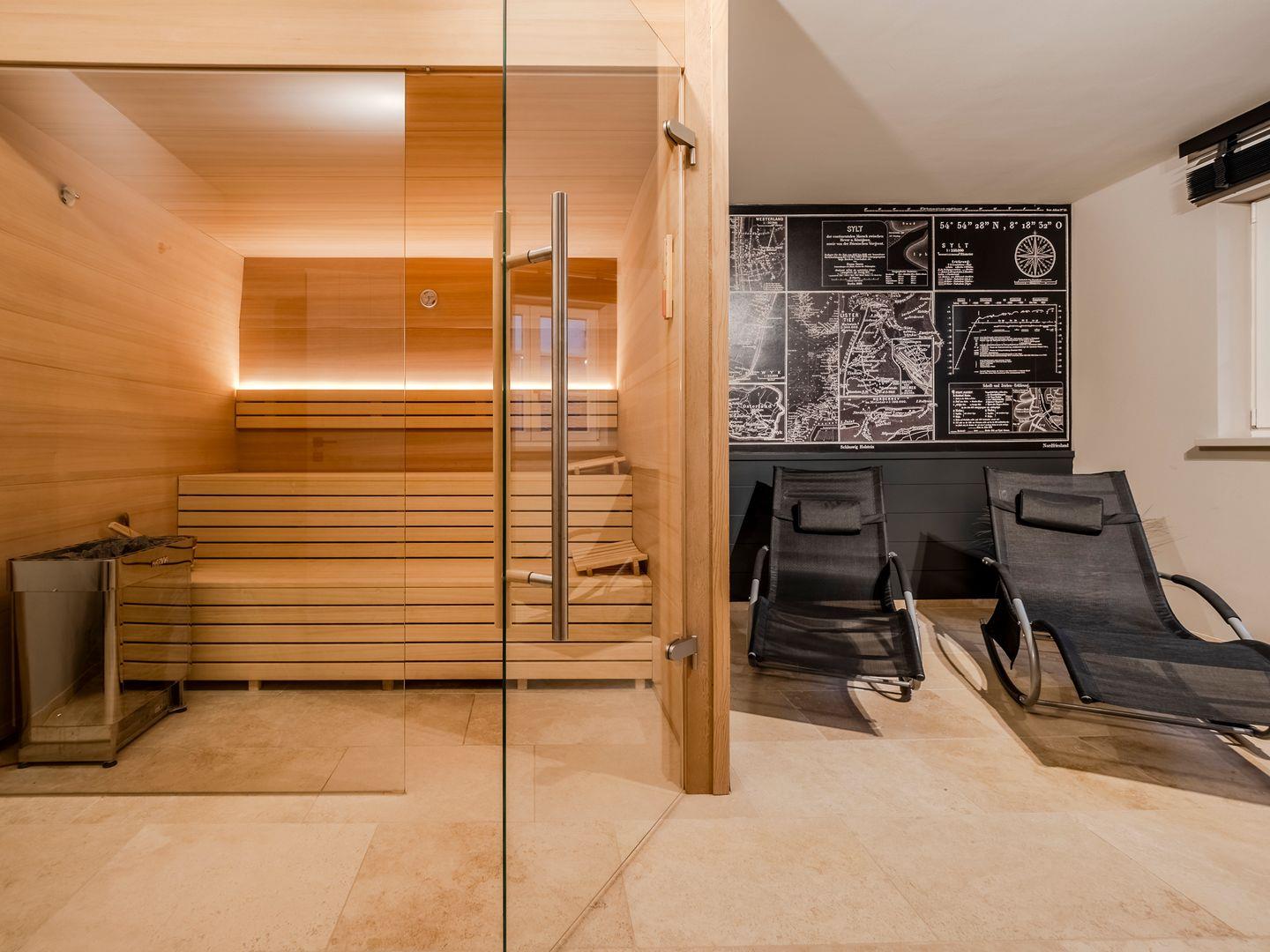 Großzügige Sauna mit schönem Ruhebereich und zwei Liegemöglichkeiten.