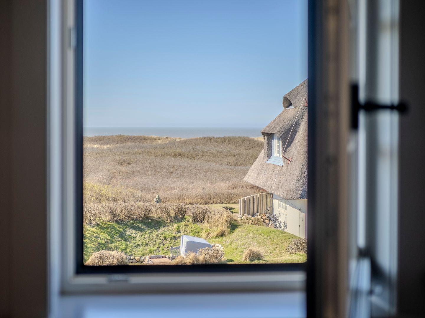 Vom Wohn- und Esszimmer gelangen Sie auf die möblierte Südterrasse mit Ganzjahresstrandkorb und können das Meeresrauschen der Nordsee hören. Eine kleine Erhebung im Garten ermöglicht den Blick über die Dünen auf die Nordsee.