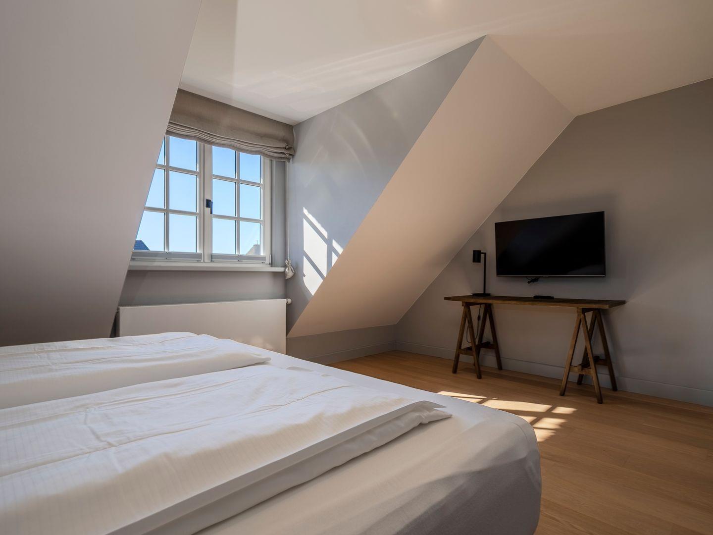 Zwei Doppelschlafzimmer und ein Schlafzimmer mit zwei Einzelbetten (80 cm x 200 cm/unter Dachschrägen - steile Treppe), die sich auch mittig zusammenstellen lassen. Alle Schlafzimmer verfügen über ein TV-Gerät, Hotelsafe, Verdunkelungsmöglichkeiten für die Fenster und Stauraum in Form von Kommoden, Garderoben oder Einbauschränken für Kleidung und persönliche Dinge. Das größte Schlafzimmer bietet einen kleinen Schreibbereich, der auch mobiles Arbeiten im Urlaub ermöglicht, einen begehbaren Kleiderschrank und Meerblick.
