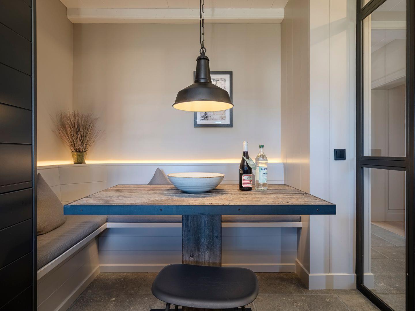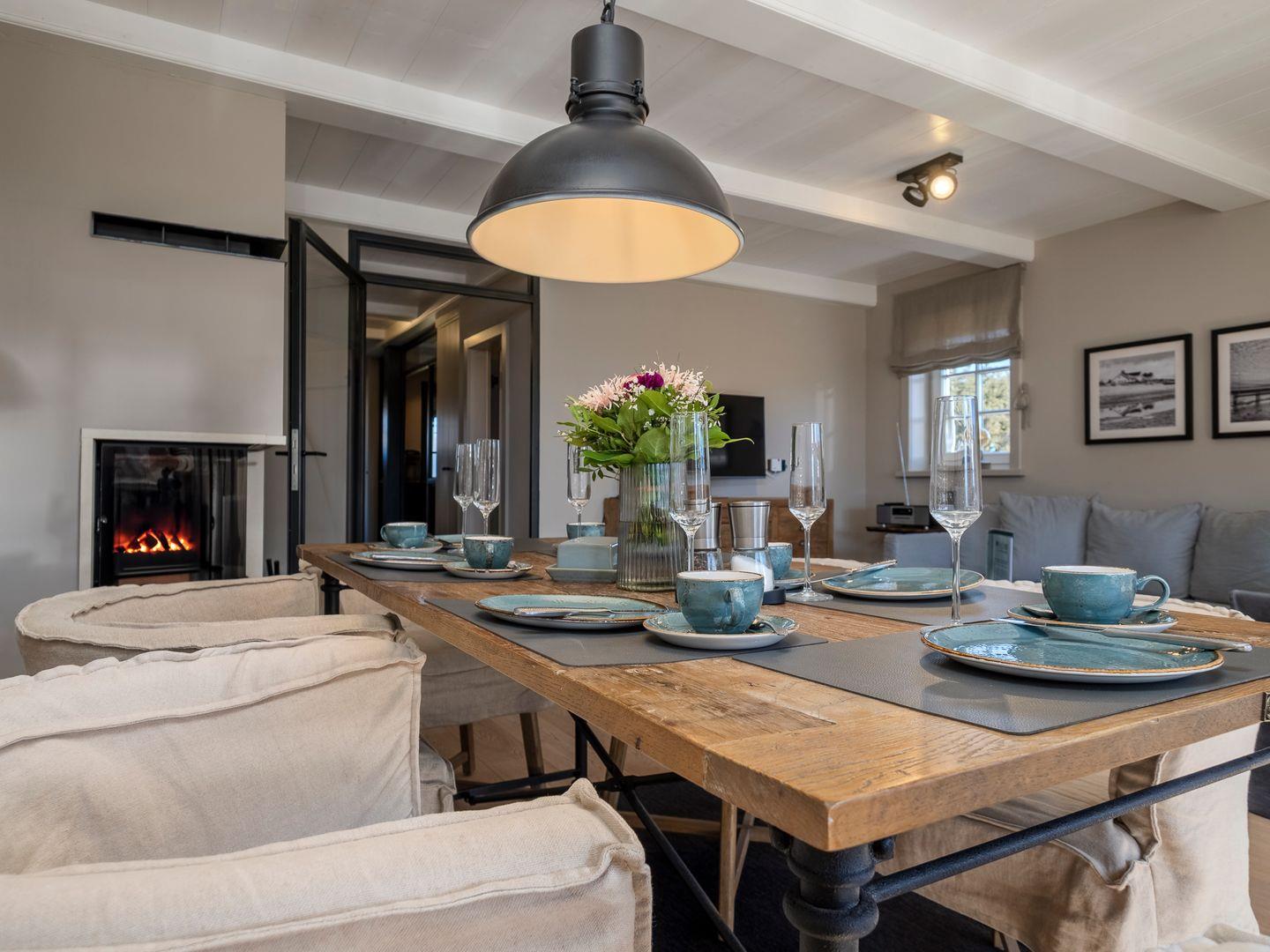 Im Erdgeschoss ist vom Flur aus die geschlossene Küche mit kleinem Essbereich und das separate Wohn- und Esszimmer begehbar. Die moderne und hochwertig ausgestattete Küche lässt mit Induktionsherd und integrierter Dunstabzugshaube, Mikrowelle mit Backofen-Funktion, Weinkühlschrank, Nespresso-Kapselmaschine und SodaStream Wassersprudler keine Wünsche offen. Ein gemütlicher Wohnraum mit freiem Blick in den Garten verfügt über einen Sofa- und Essbereich, die mit Kamin und TV zum Verweilen einladen.