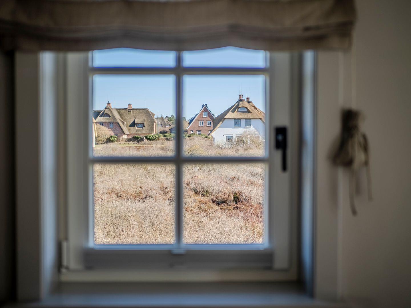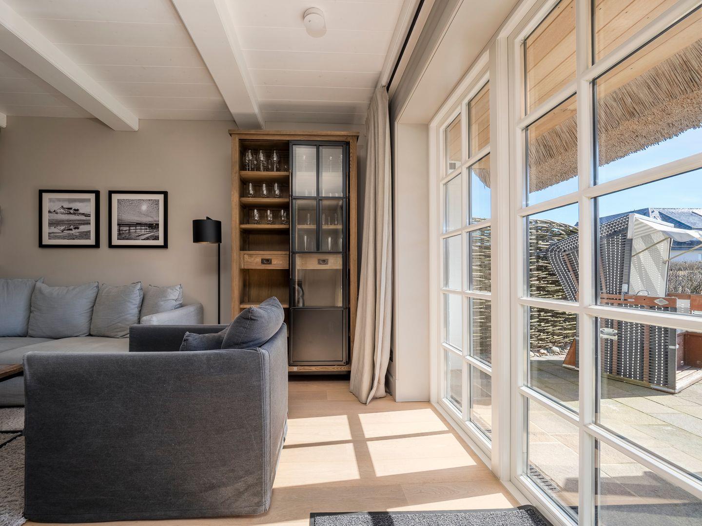 Vom Wohn- und Esszimmer gelangen Sie auf die möblierte Südterrasse mit Ganzjahresstrandkorb und können das Meeresrauschen der Nordsee hören. Eine kleine Erhebung im Garten ermöglicht den Blick über die Dünen auf die Nordsee.
