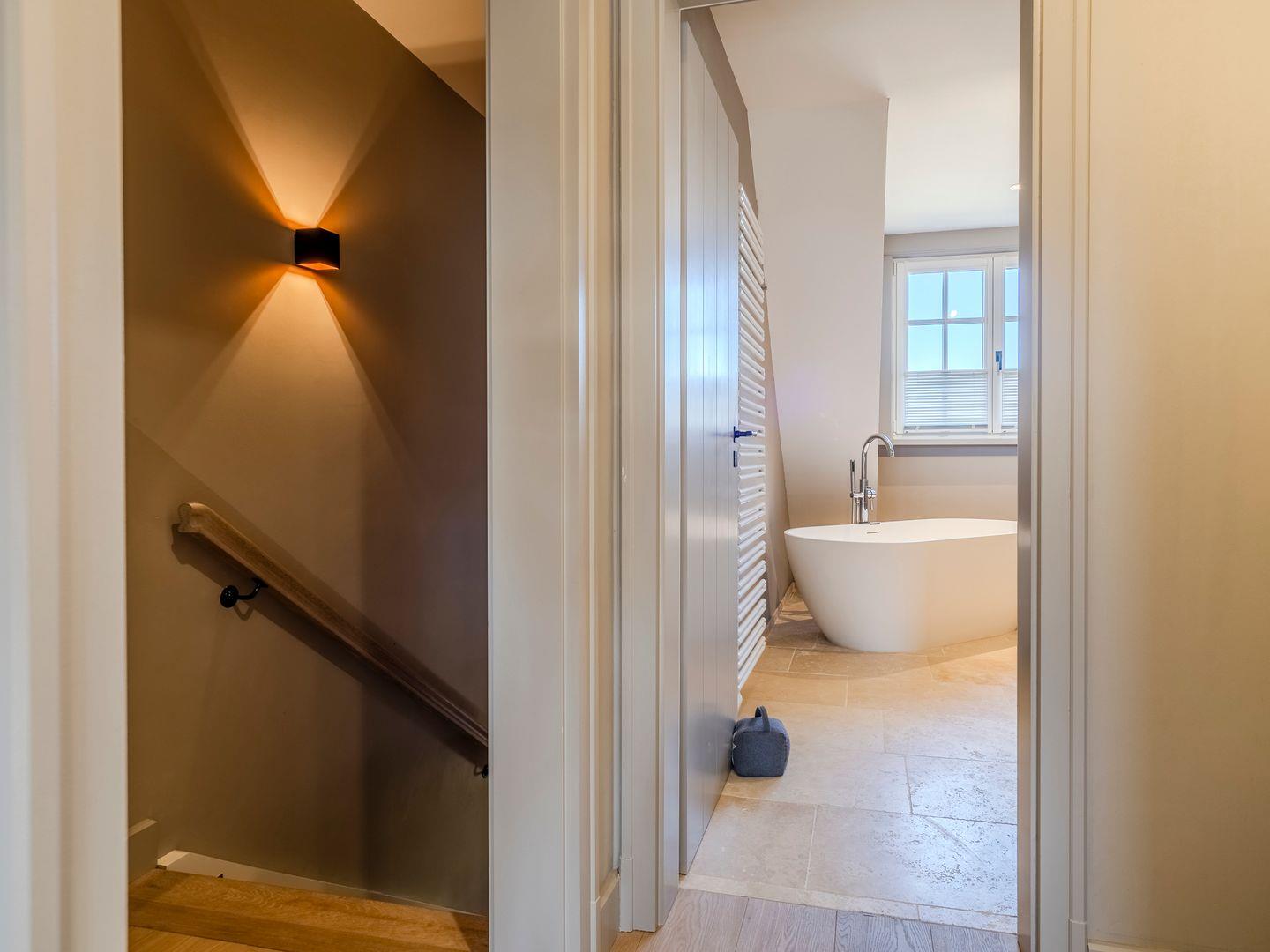 Zwei Badezimmer mit bodengleicher Regendusche, Handtuchtrockner und Fenster. Eines der Badezimmer verfügt zusätzlich über eine freistehende Badewanne, Radio und Meerblick.