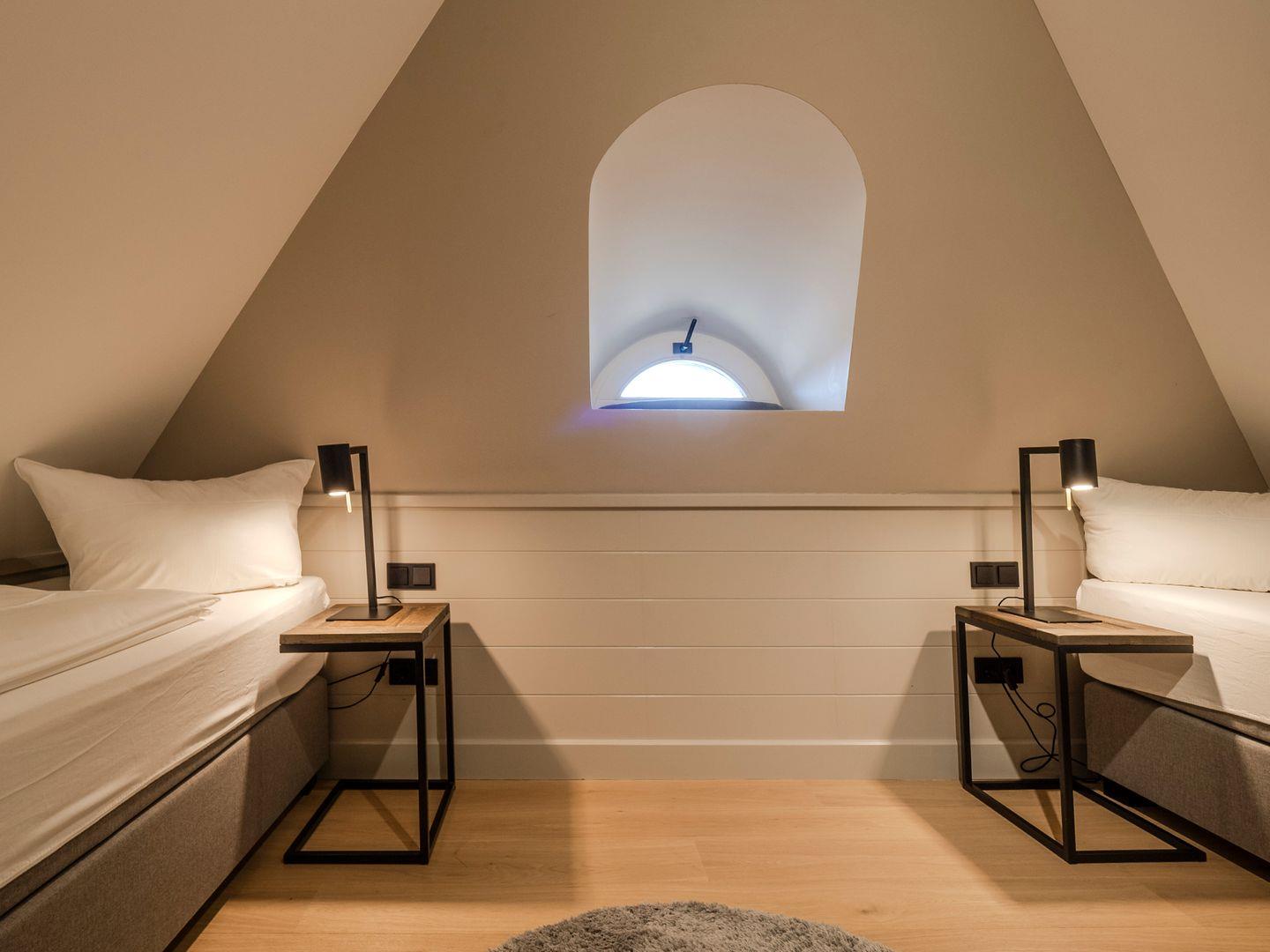 Zwei Doppelschlafzimmer und ein Schlafzimmer mit zwei Einzelbetten (80 cm x 200 cm/unter Dachschrägen - steile Treppe), die sich auch mittig zusammenstellen lassen. Alle Schlafzimmer verfügen über ein TV-Gerät, Hotelsafe, Verdunkelungsmöglichkeiten für die Fenster und Stauraum in Form von Kommoden, Garderoben oder Einbauschränken für Kleidung und persönliche Dinge. Das größte Schlafzimmer bietet einen kleinen Schreibbereich, der auch mobiles Arbeiten im Urlaub ermöglicht, einen begehbaren Kleiderschrank und Meerblick.