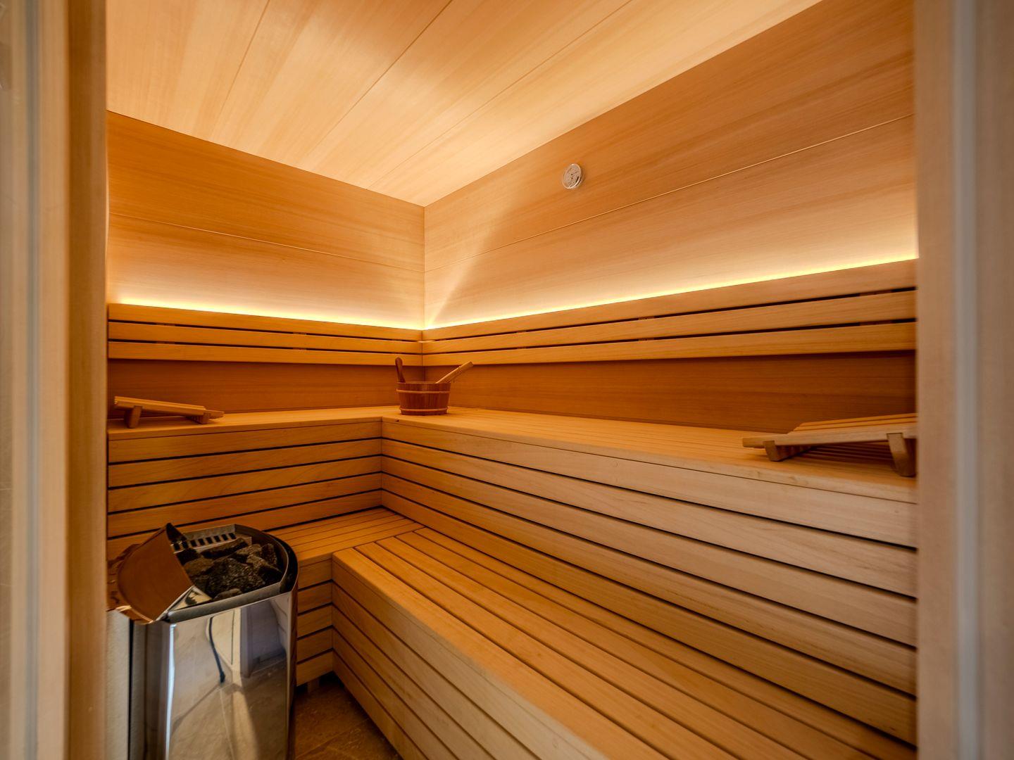 Großzügige Sauna mit schönem Ruhebereich und zwei Liegemöglichkeiten.