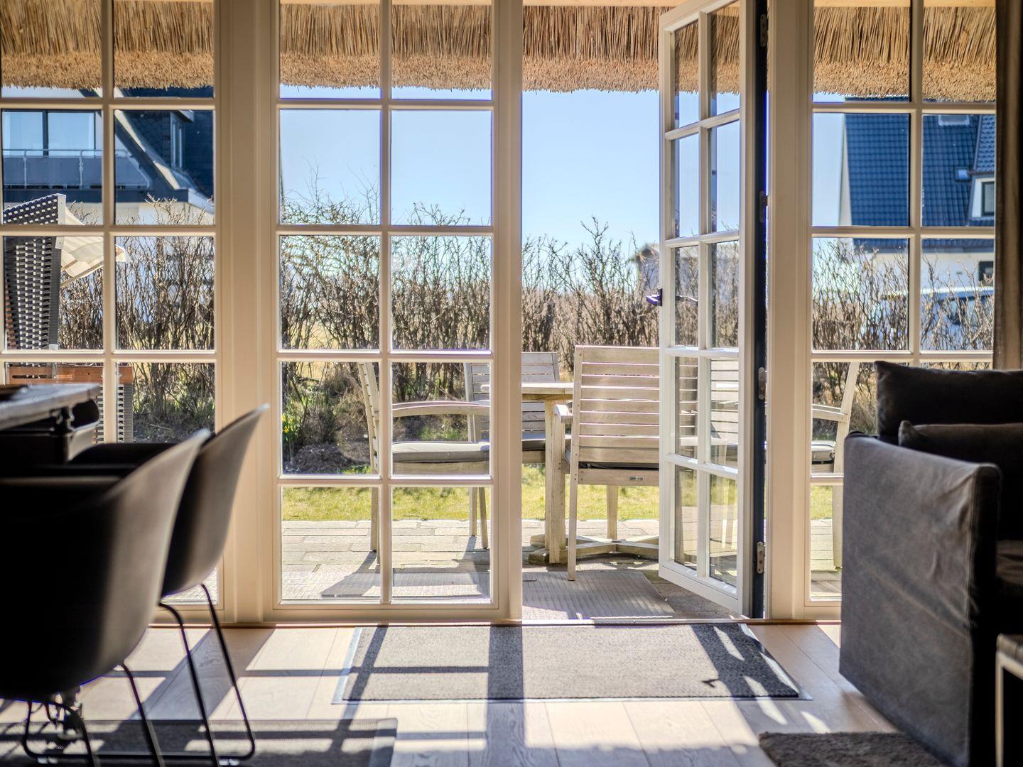 Vom Wohn- und Esszimmer gelangen Sie auf die möblierte Südterrasse mit Ganzjahresstrandkorb und können das Meeresrauschen der Nordsee hören. Eine kleine Erhebung im Garten ermöglicht den Blick über die Dünen auf die Nordsee.