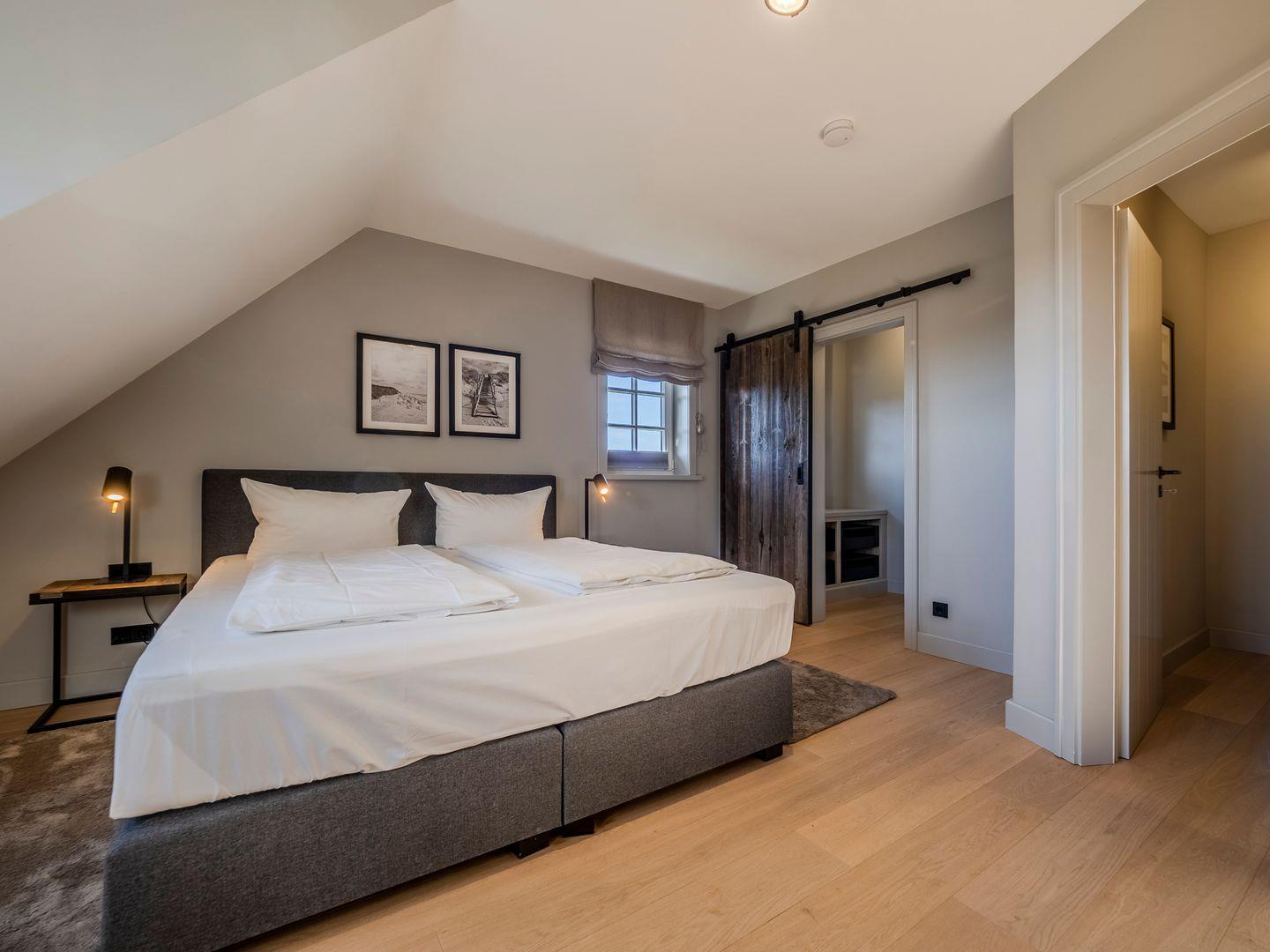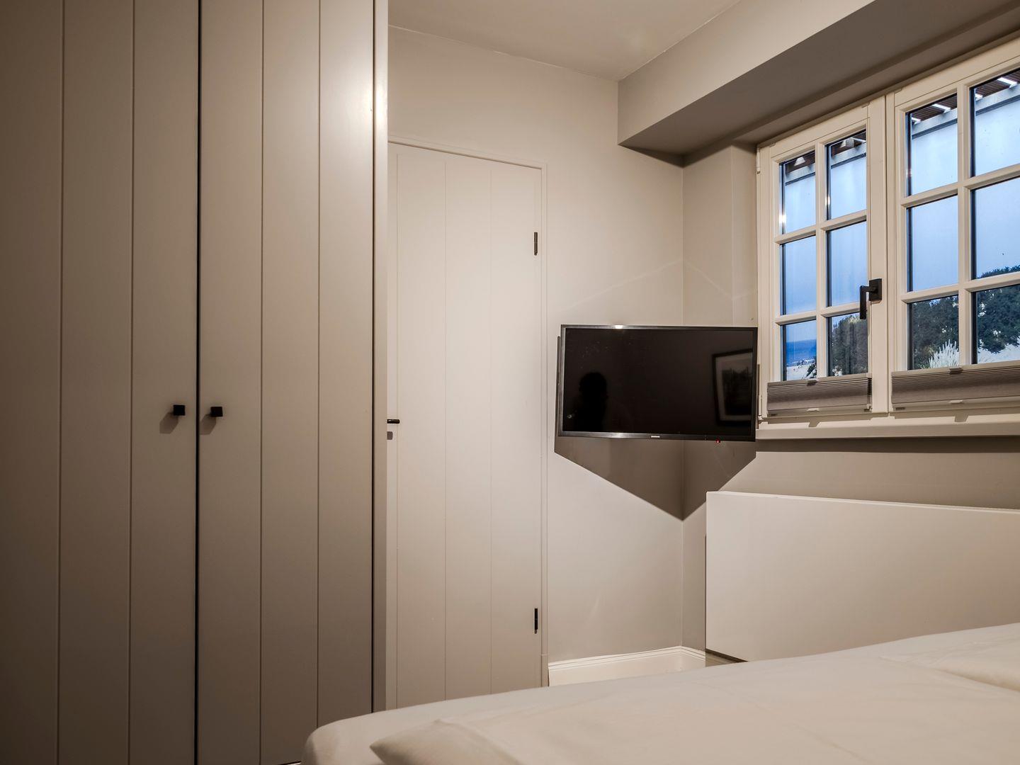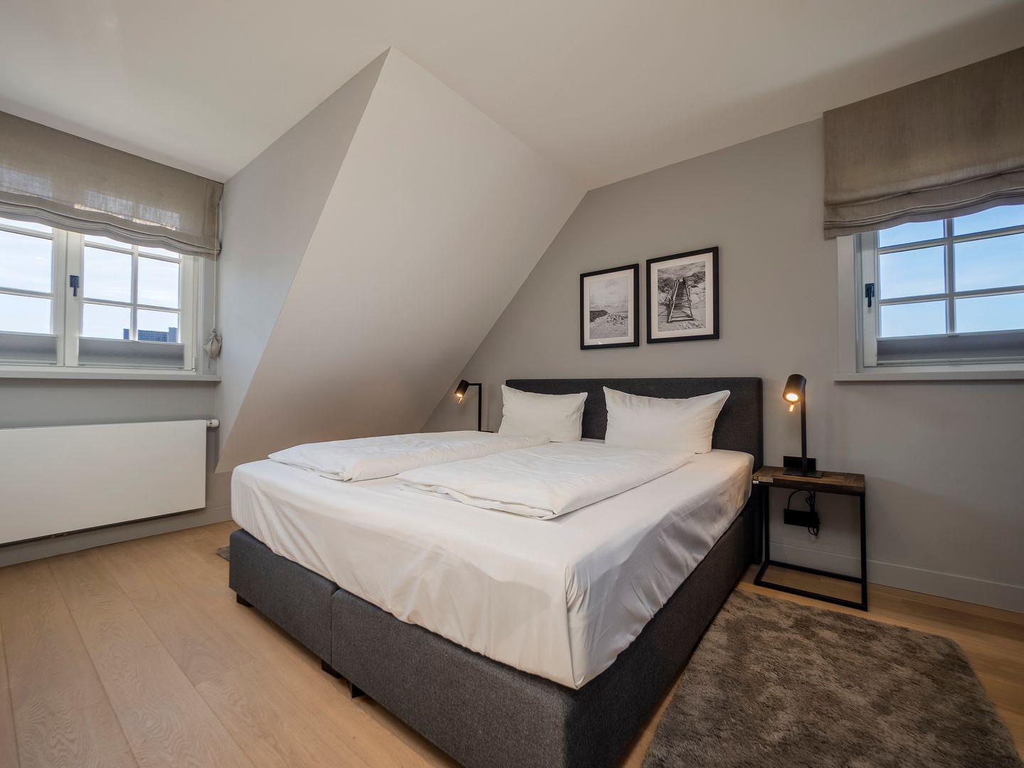 Zwei Doppelschlafzimmer und ein Schlafzimmer mit zwei Einzelbetten (80 cm x 200 cm/unter Dachschrägen - steile Treppe), die sich auch mittig zusammenstellen lassen. Alle Schlafzimmer verfügen über ein TV-Gerät, Hotelsafe, Verdunkelungsmöglichkeiten für die Fenster und Stauraum in Form von Kommoden, Garderoben oder Einbauschränken für Kleidung und persönliche Dinge. Das größte Schlafzimmer bietet einen kleinen Schreibbereich, der auch mobiles Arbeiten im Urlaub ermöglicht, einen begehbaren Kleiderschrank und Meerblick.