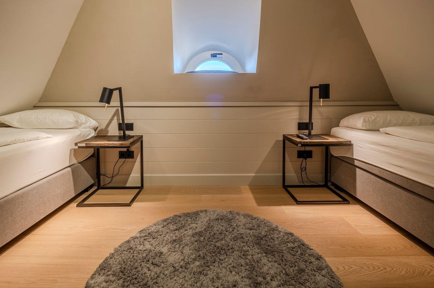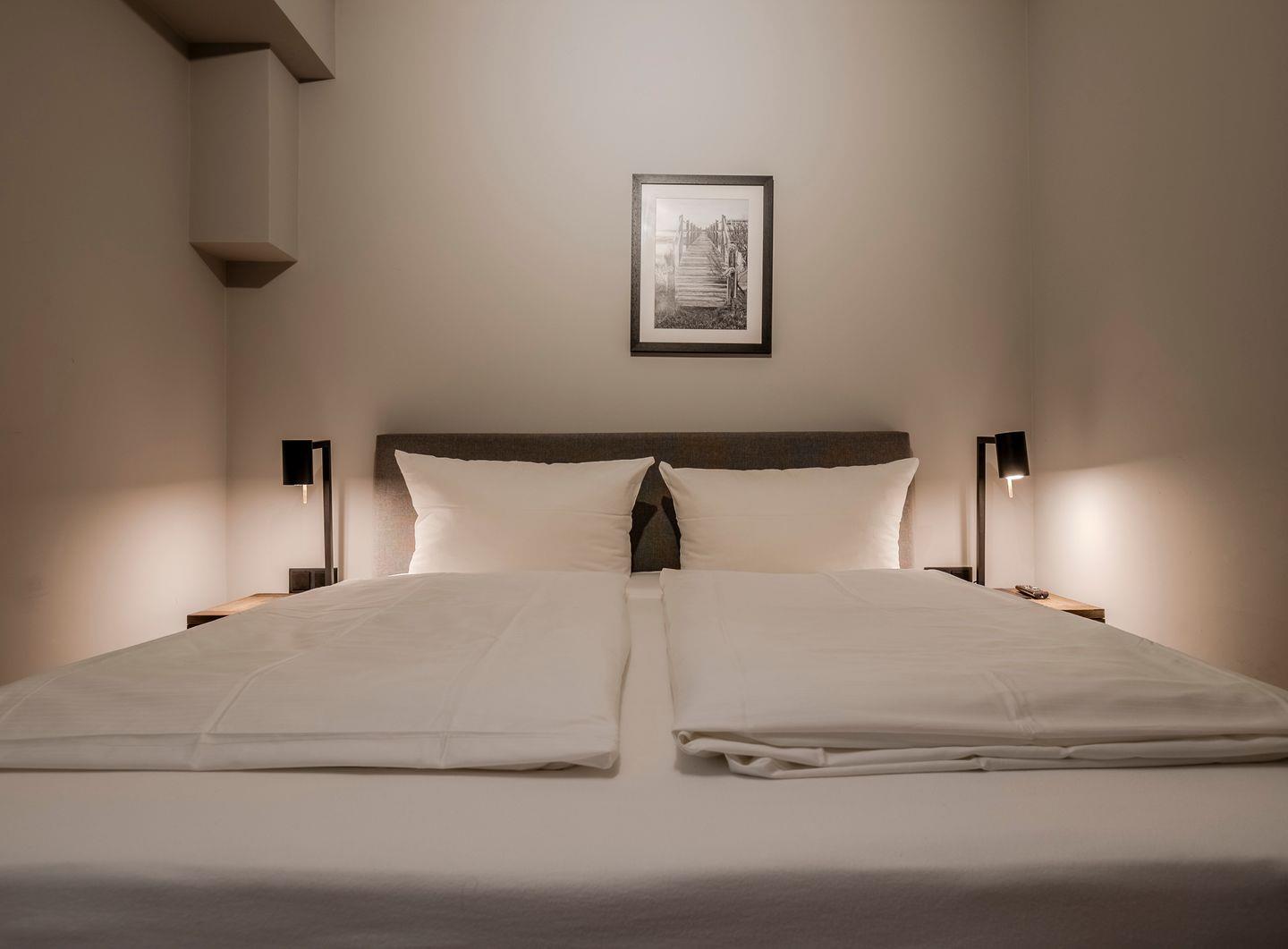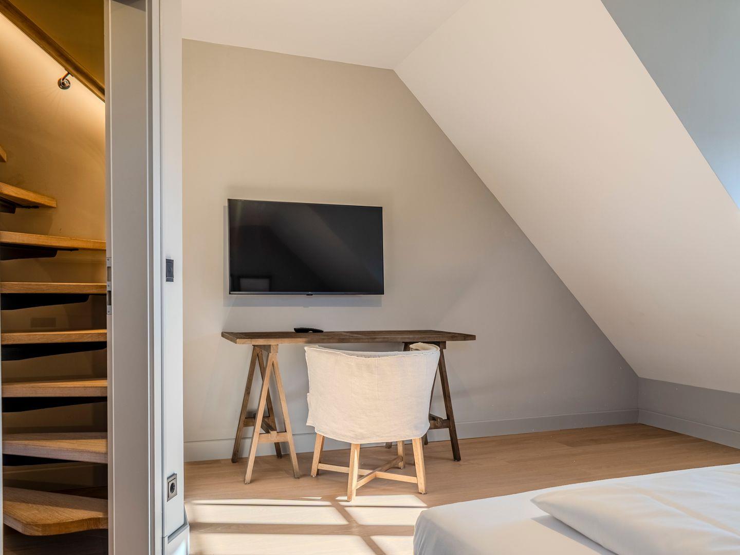 Zwei Doppelschlafzimmer und ein Schlafzimmer mit zwei Einzelbetten (80 cm x 200 cm/unter Dachschrägen - steile Treppe), die sich auch mittig zusammenstellen lassen. Alle Schlafzimmer verfügen über ein TV-Gerät, Hotelsafe, Verdunkelungsmöglichkeiten für die Fenster und Stauraum in Form von Kommoden, Garderoben oder Einbauschränken für Kleidung und persönliche Dinge. Das größte Schlafzimmer bietet einen kleinen Schreibbereich, der auch mobiles Arbeiten im Urlaub ermöglicht, einen begehbaren Kleiderschrank und Meerblick.