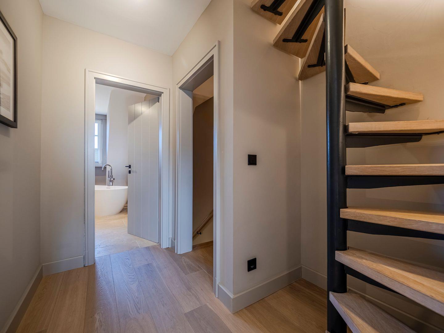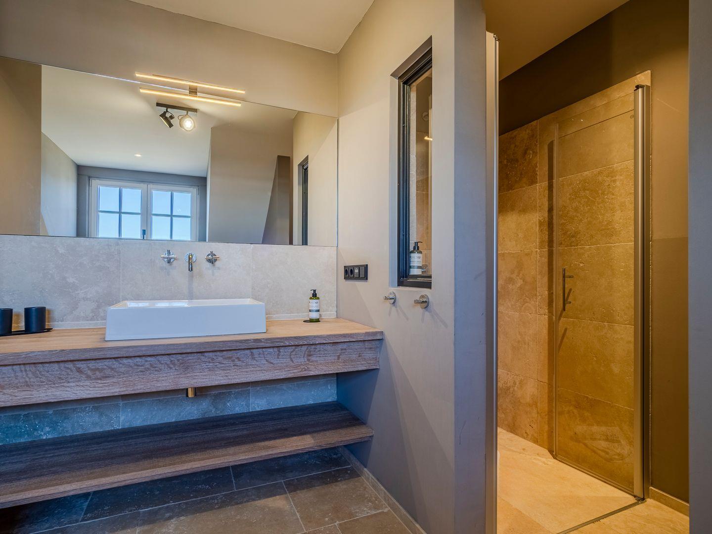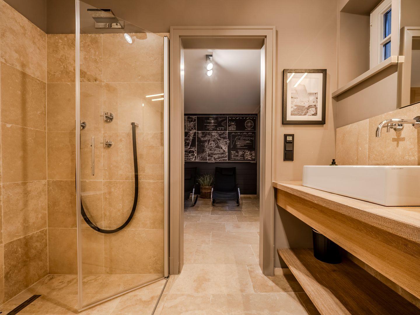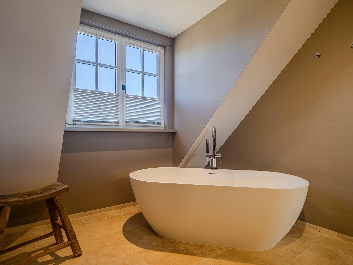 Zwei Badezimmer mit bodengleicher Regendusche, Handtuchtrockner und Fenster. Eines der Badezimmer verfügt zusätzlich über eine freistehende Badewanne, Radio und Meerblick.