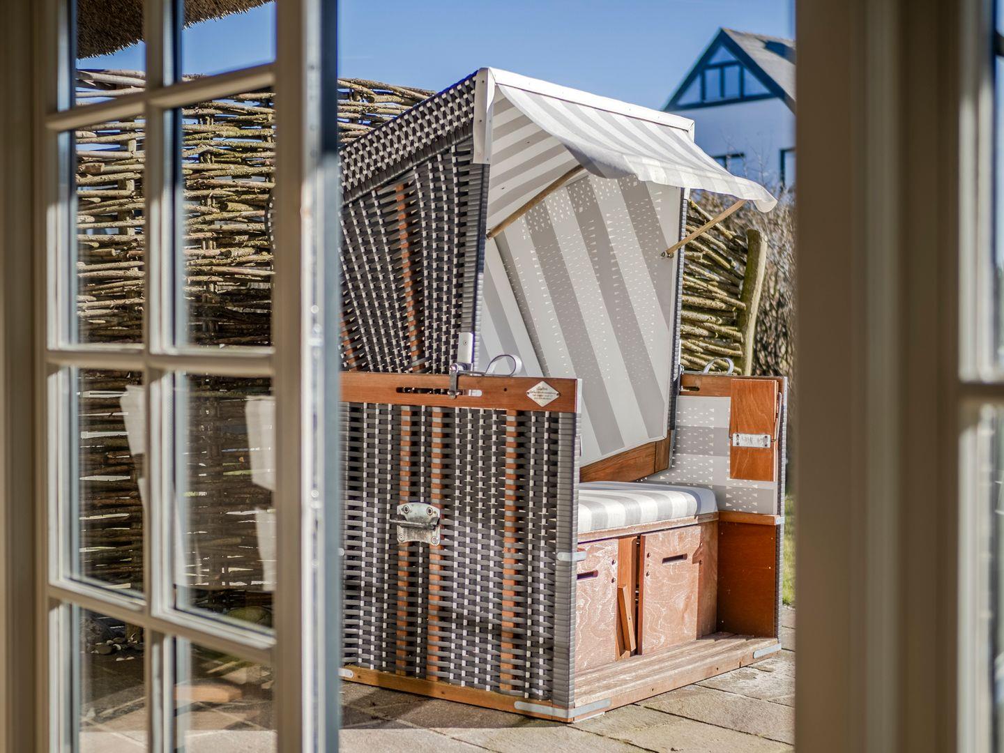Vom Wohn- und Esszimmer gelangen Sie auf die möblierte Südterrasse mit Ganzjahresstrandkorb und können das Meeresrauschen der Nordsee hören. Eine kleine Erhebung im Garten ermöglicht den Blick über die Dünen auf die Nordsee.