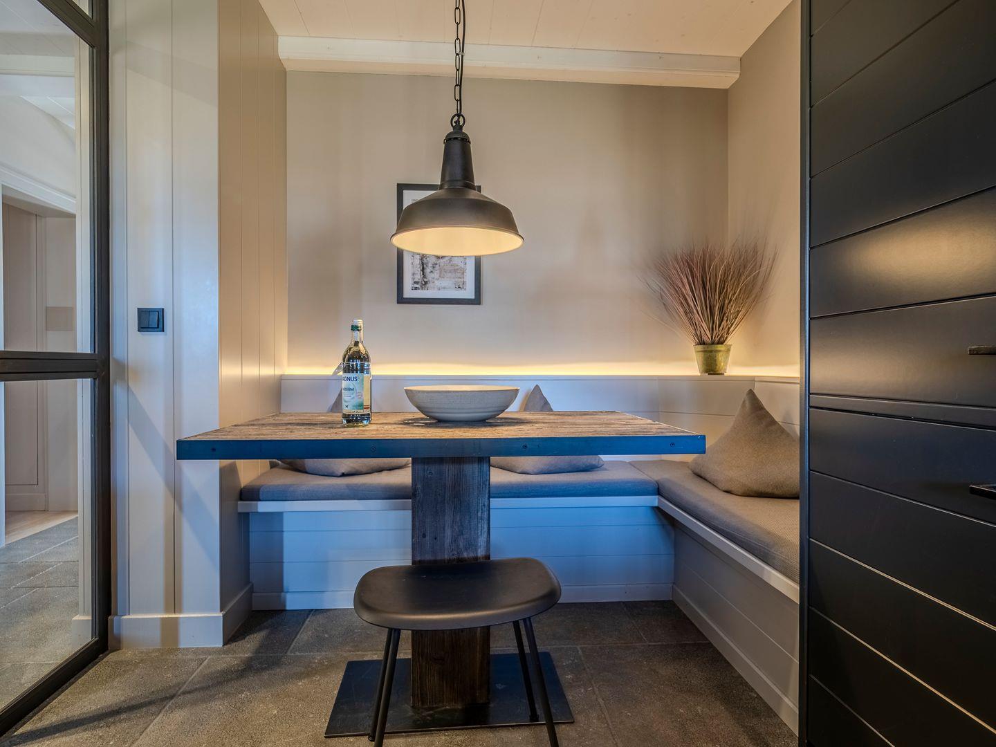 Im Erdgeschoss ist vom Flur aus die geschlossene Küche mit kleinem Essbereich und das separate Wohn- und Esszimmer begehbar. Die moderne und hochwertig ausgestattete Küche lässt mit Induktionsherd und integrierter Dunstabzugshaube, Mikrowelle mit Backofen-Funktion, Weinkühlschrank, Nespresso-Kapselmaschine und SodaStream Wassersprudler keine Wünsche offen. Ein gemütlicher Wohnraum mit freiem Blick in den Garten verfügt über einen Sofa- und Essbereich, die mit Kamin und TV zum Verweilen einladen.