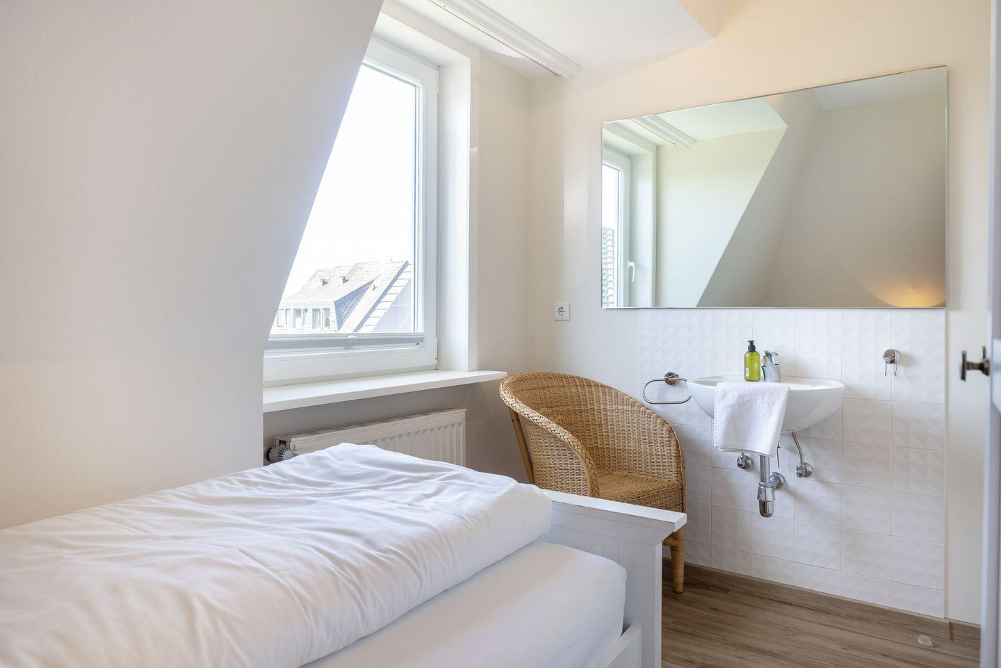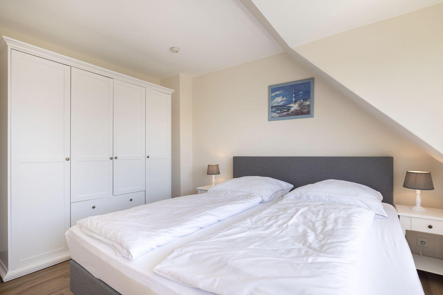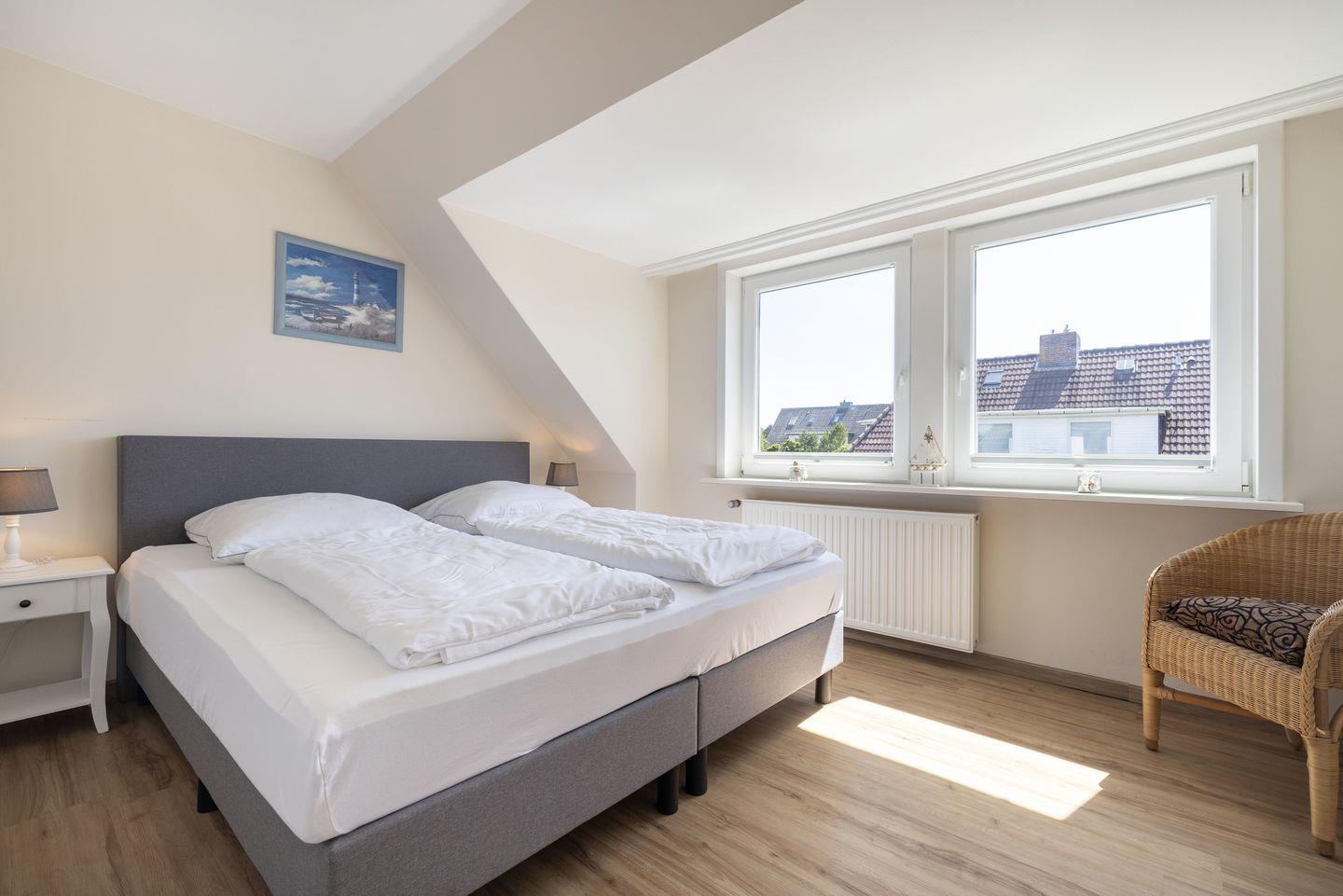 OG: Ein Raum mit Doppelbett (180x200cm), ein Raum mit kleinem Doppelbett (140x200cm), ein Raum mit Einzelbett (90x200cm). Duschbad.