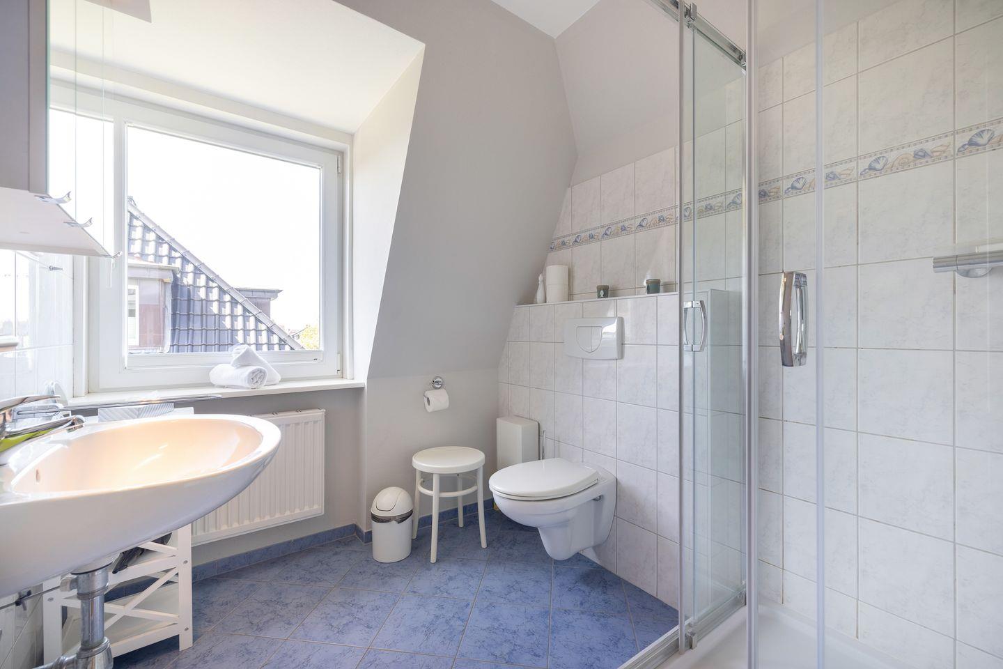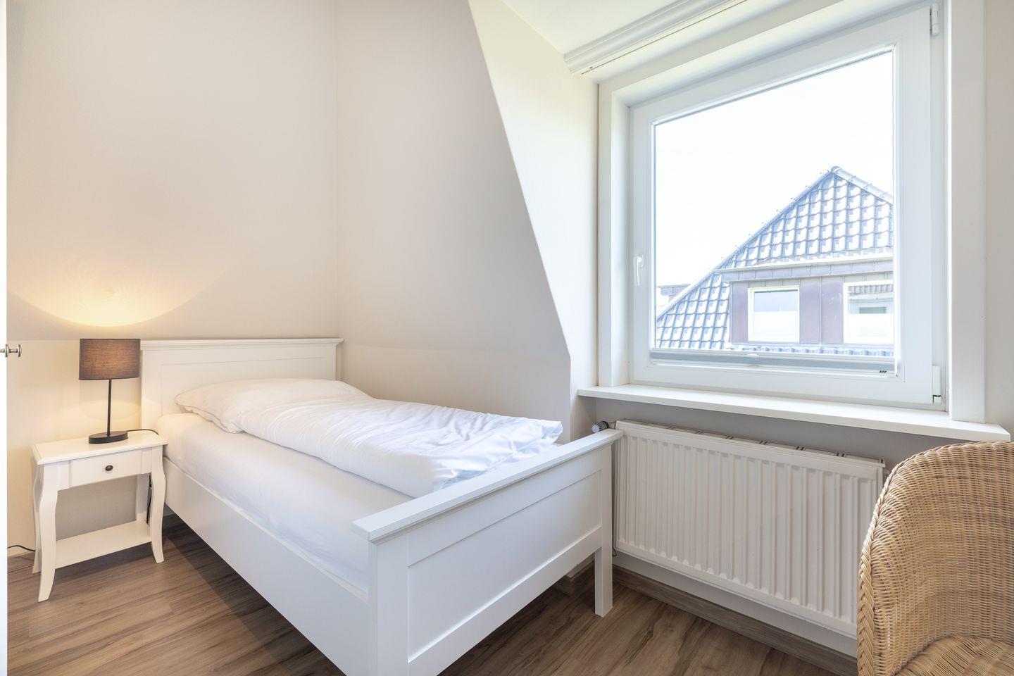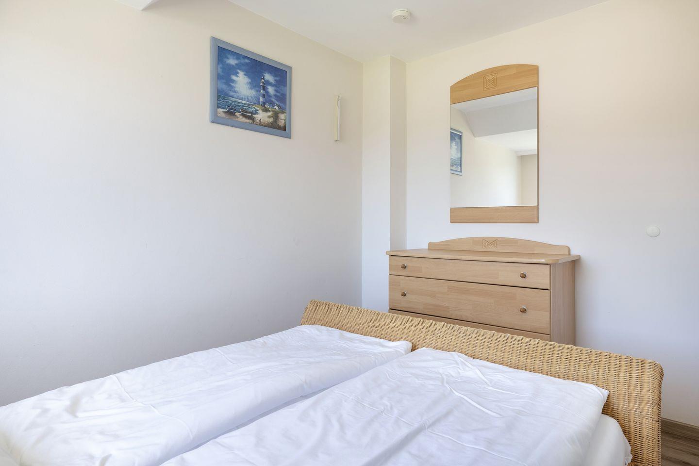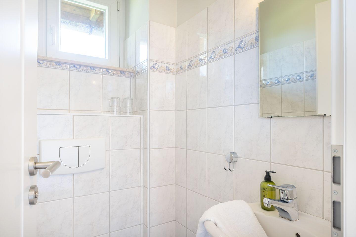 OG: Ein Raum mit Doppelbett (180x200cm), ein Raum mit kleinem Doppelbett (140x200cm), ein Raum mit Einzelbett (90x200cm). Duschbad.
