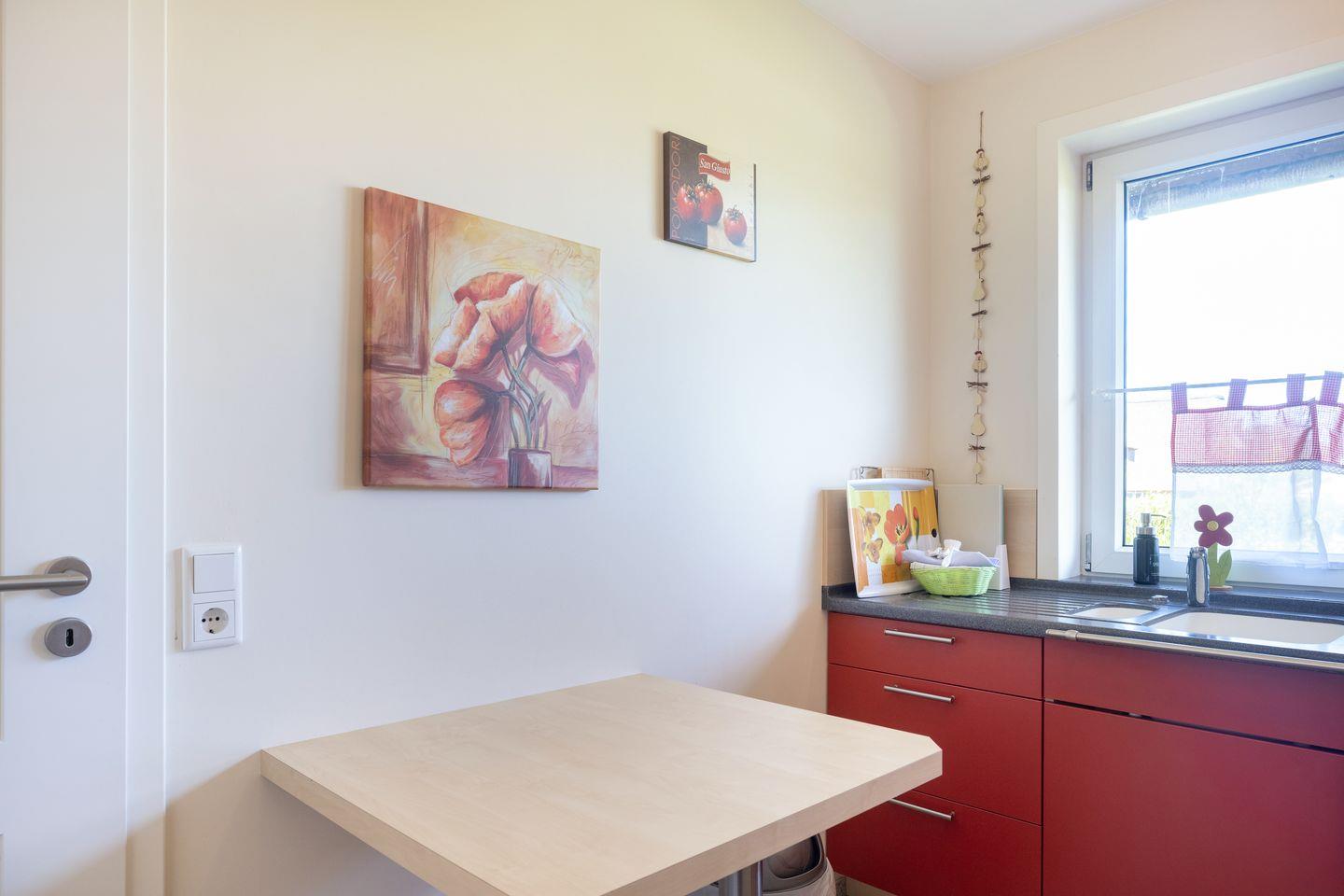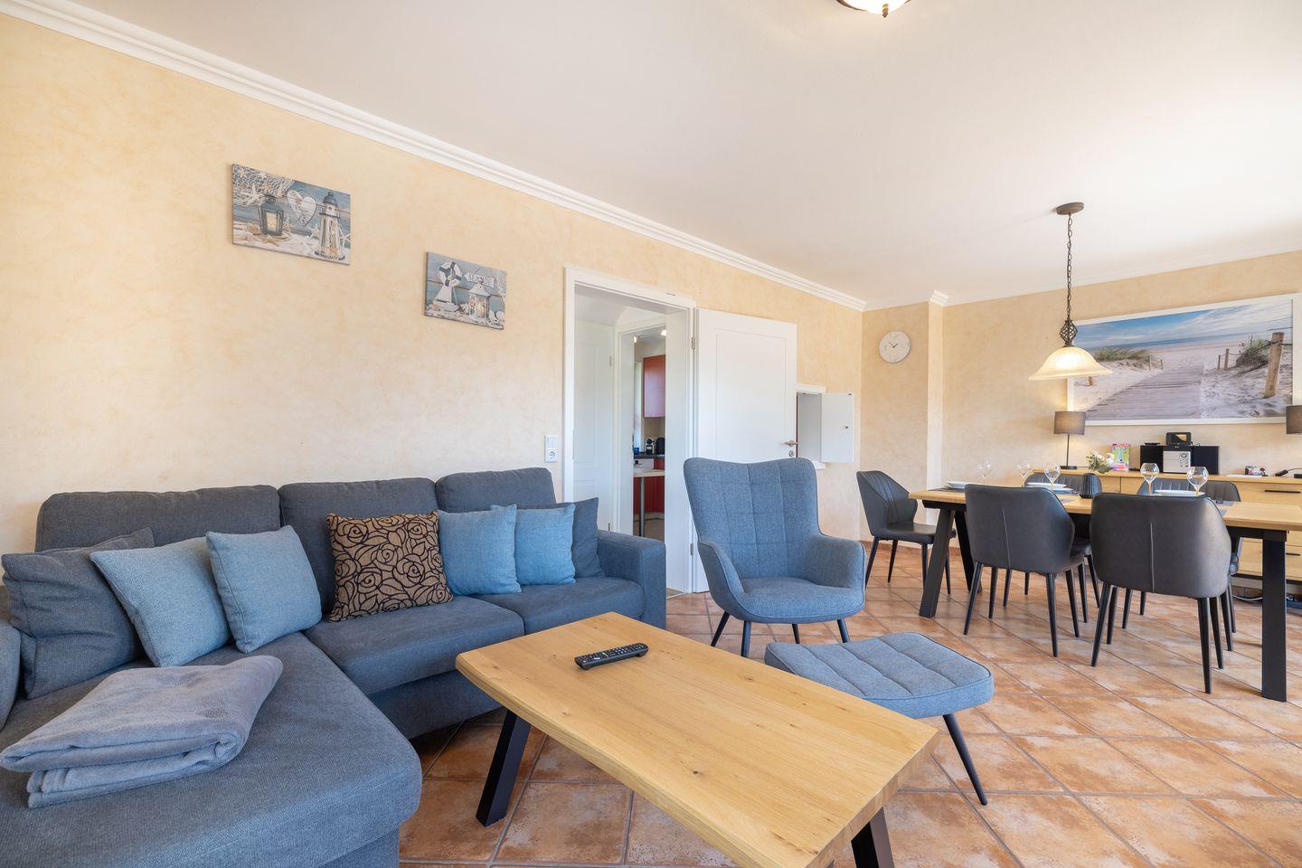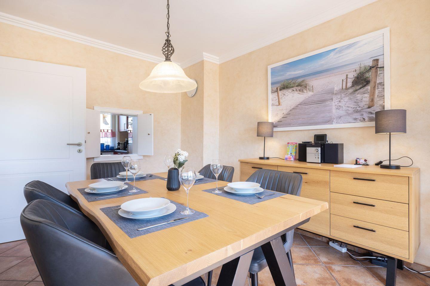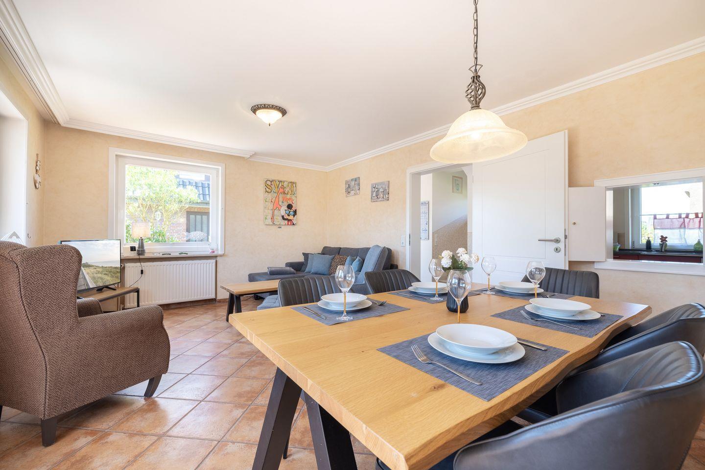EG: Wohnraum mit Flatscreen-TV, W-Lan und offenem Essbereich. Separate Küche mit Backofen, Ceranfeld, Filterkaffeemaschine, Geschirrspüler. Gäste-WC. Terrasse mit Gartenmöbeln und kleinem Garten.