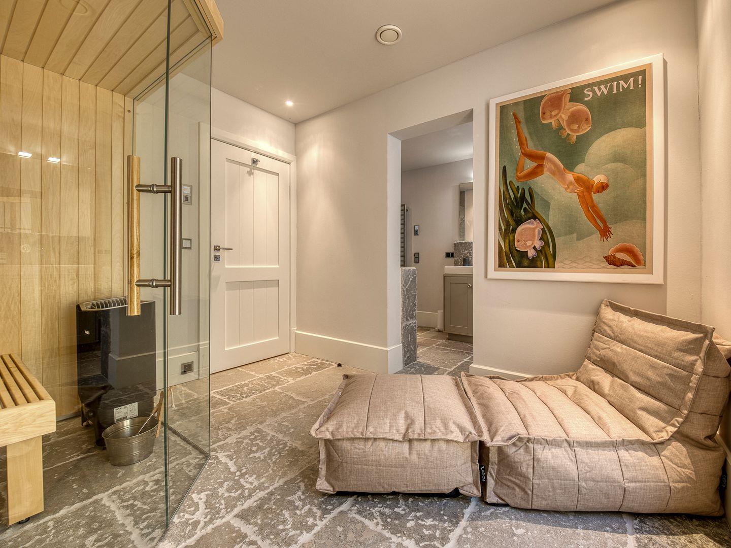 Drei helle und bodengleiche Duschbäder mit Regenduschkopf, Handtuchtrockner und Fenster. Eines der Badezimmer ist zusätzlich mit einer Badewanne ausgestattet und grenzt an die Sauna und einen kleinen Ruhebereich.