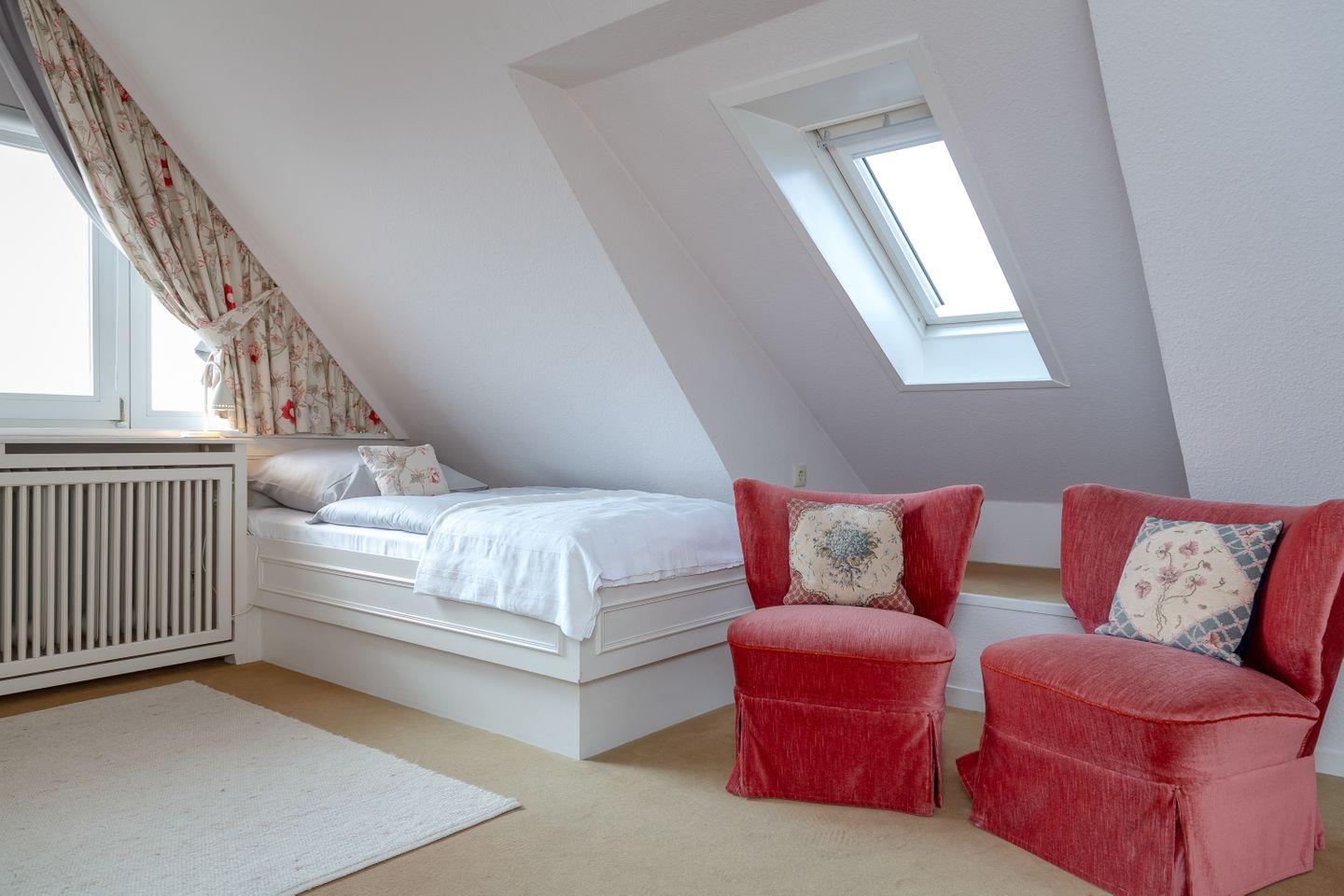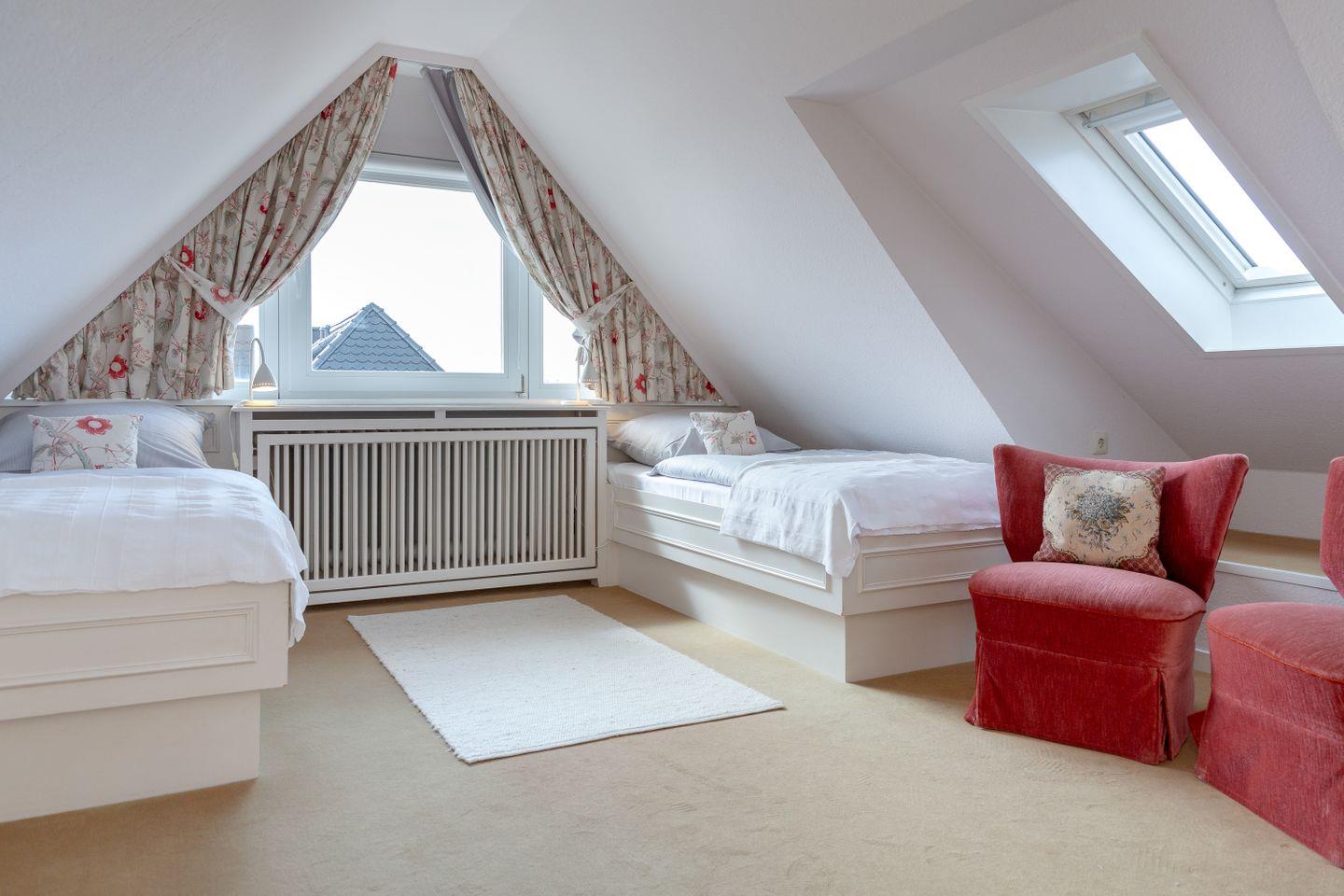 Im Obergeschoss erwartet Sie ein komfortables Schlafzimmer mit zwei Einzelbetten und einer gemütlichen Sitzecke. Zusätzlich bietet das Wohnzimmer ein praktisches Schrankbett für eine weitere Person. Das moderne Badezimmer sorgt mit seiner zeitgemäßen Ausstattung für angenehmen Komfort.