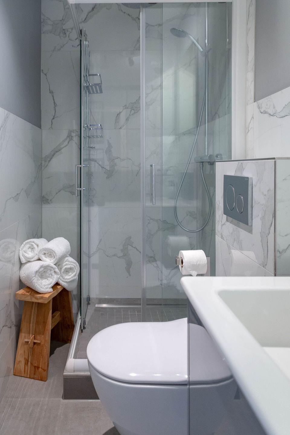In den Badezimmern, die von Tageslicht durchströmt sind, empfängt Sie komfortabel eine ebenerdige Dusche, und im zweiten Badezimmer befindet sich zusätzlich eine Badewanne zum Entspannen.