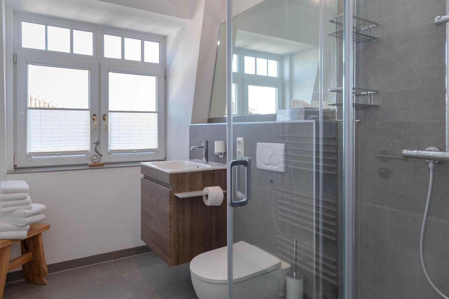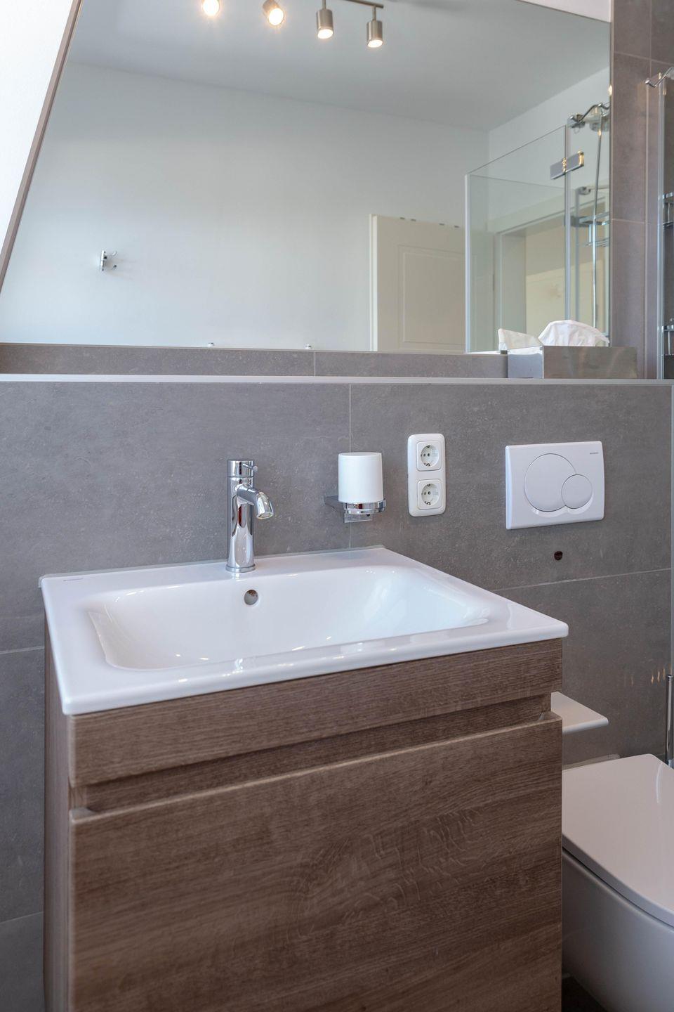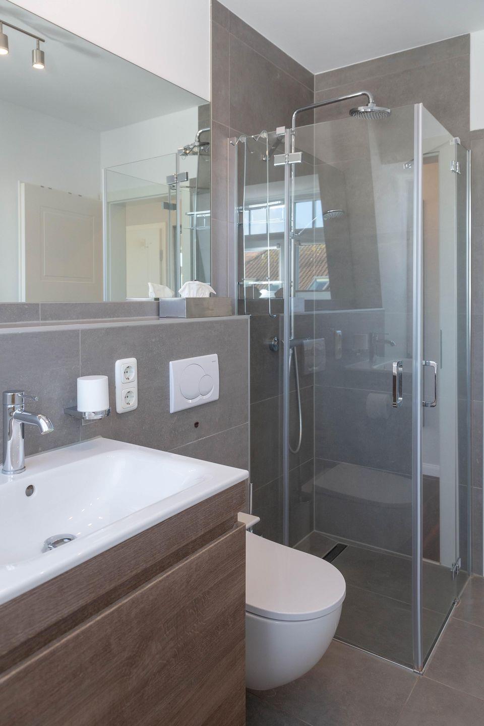 Das Badezimmer ist von Tageslicht durchströmt sind und empfängt Sie komfortabel mit einer ebenerdigen Dusche. Im Keller dieses Hauses befinden sich Waschmaschine und Trockner, welche sie kostenfrei nutzen können.