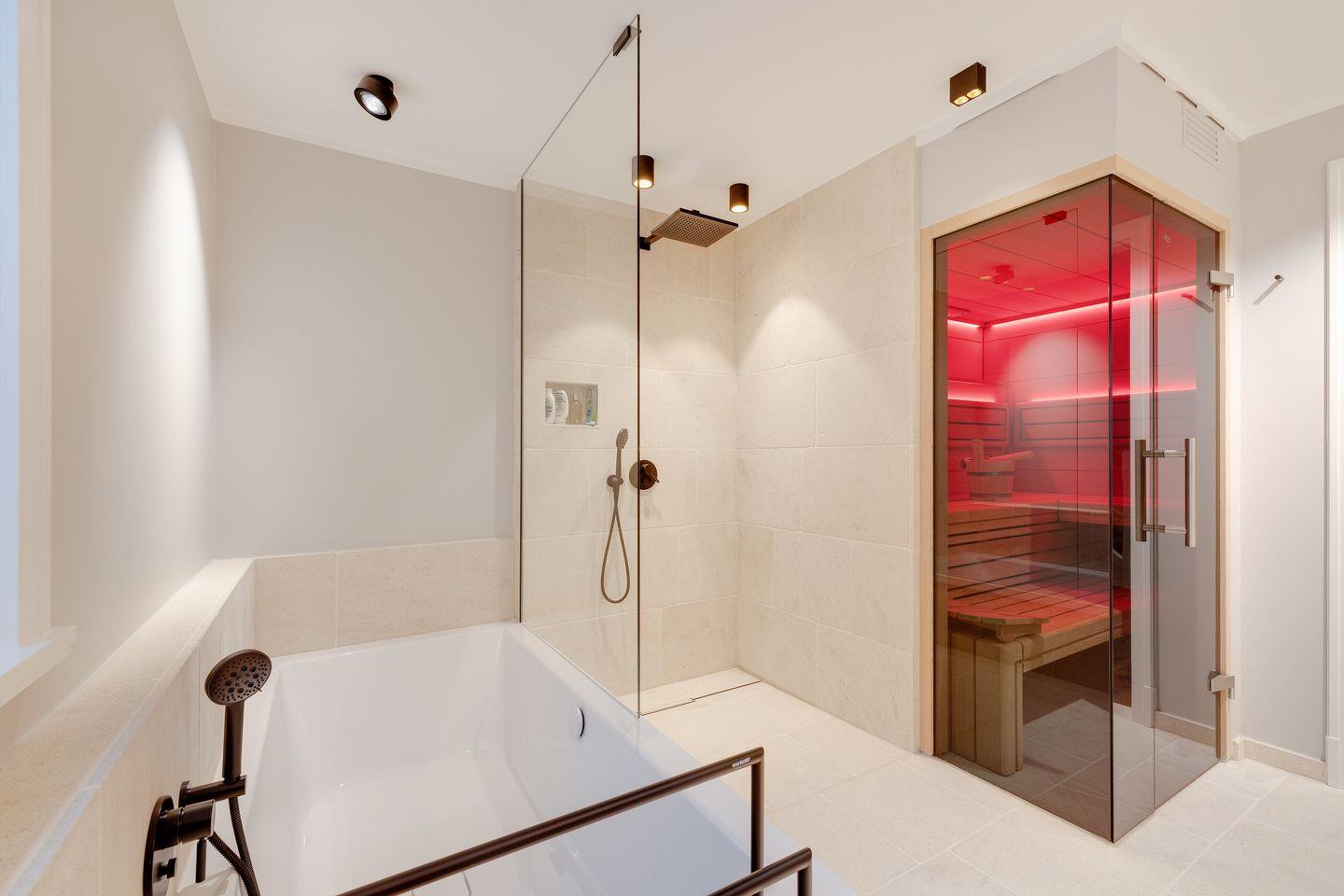 UG: Raum mit Doppelbett (200x200cm) mit Flatscreen TV, Badezimmer mit Dusche, Badewanne, WC und Sauna, separates WC.