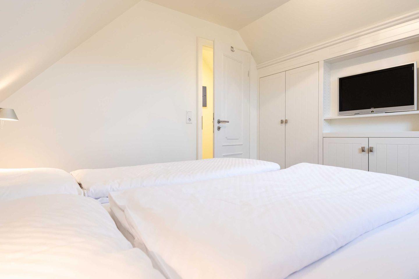 Schlafzimmer 2: 2 Einzelbetten, Kleiderschrank, TV und Fenster.