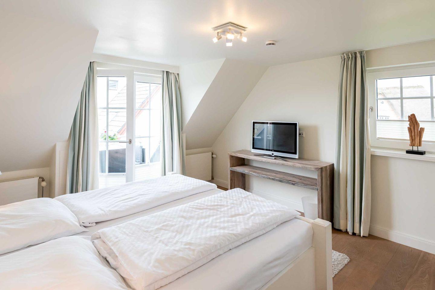 Schlafzimmer 1: Doppelbett, Kleiderschrank, TV, Fenster und kleiner Südbalkon mit Balkonmöbeln.