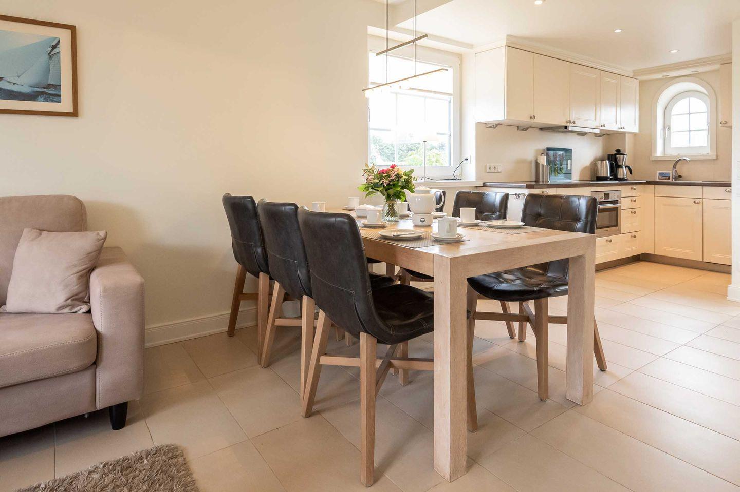Im lichtdurchfluteten Erdgeschoss befindet sich ein kleiner Flur mit Garderobe und die gut ausgestattete, abgeschlossene Küche mit direktem Durchgang zum Wohn- und Essbereich: