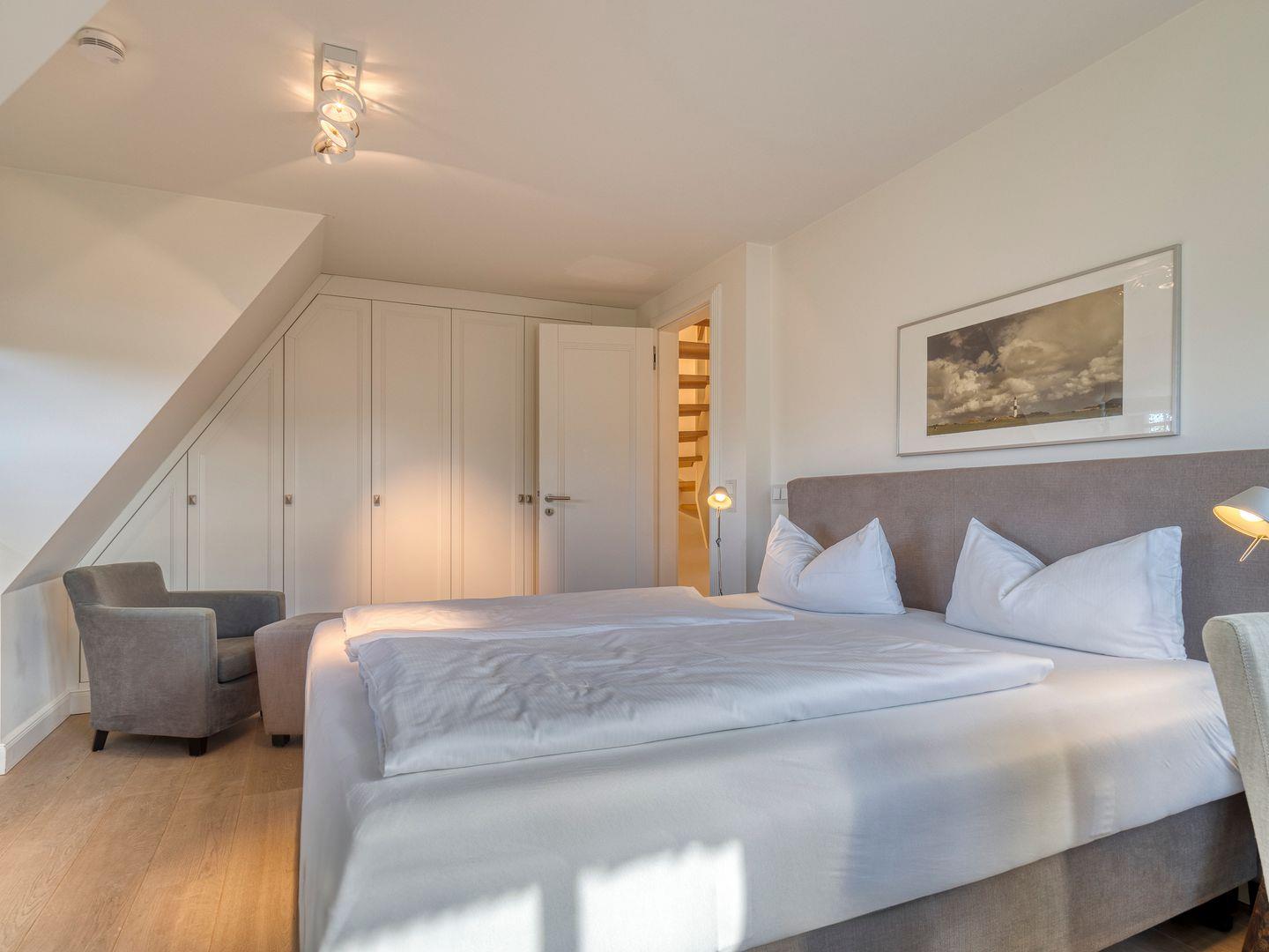 Schlafzimmer 1: Boxspringbett, Einbauschränke, TV und Fenster. Ein kleiner Schreibbereich ermöglicht mobiles Arbeiten im Urlaub.