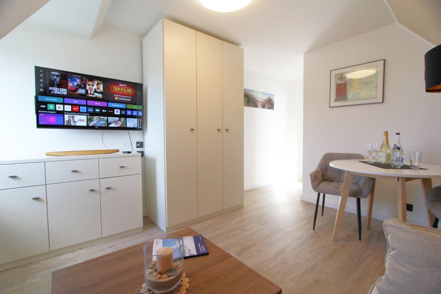 Im Wohnbereich im Obergeschoss steht Ihnen ein bequemes 2er-Sofa zur Verfügung, auf dem Sie sich nach dem Tag vor dem TV entspannen können.